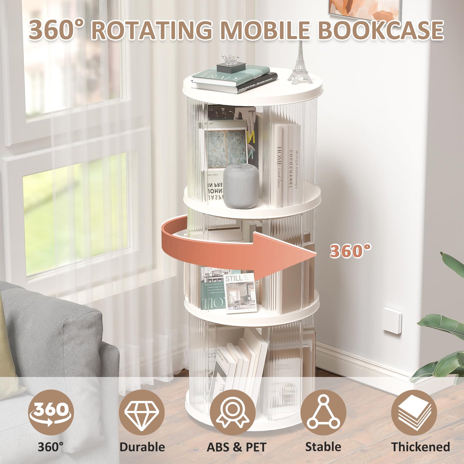 360° Rotating Bookshelf for Small Spaces, Display Rack, Modern Acrylic Corner Spinning Bookshelf with Turntable, 3 Tier Floor Standing Bookcase For Kids Adults, Book Organizer for Bedroom, Living Room