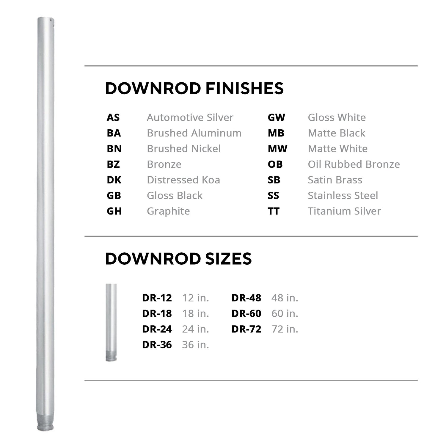 Details: WAC Ceiling Fan Downrods should only be used with WAC Ceiling Fans. Our downrods are manufactured to work with WAC fans only, failure to use with a WAC fan only can result in damage or injury. WAC downrods are 3/4 in. outter diameter and can be used to extend your WAC ceiling fan height. Downrods are available in 12in, 18in, 24in, 36in, 48in, 60in, and 72in in a variety of finish options to match your fan finish. Downrods can also be joined together using a downrod coupler (DC-xx) to create lengths greater than 72in. All WAC downrods have a single threaded end on the motor side and can be shortened in the field by cutting the un-threaded side, for instance if you need a 10in downrod you can purchase a 12in and field shorten it by 2in.