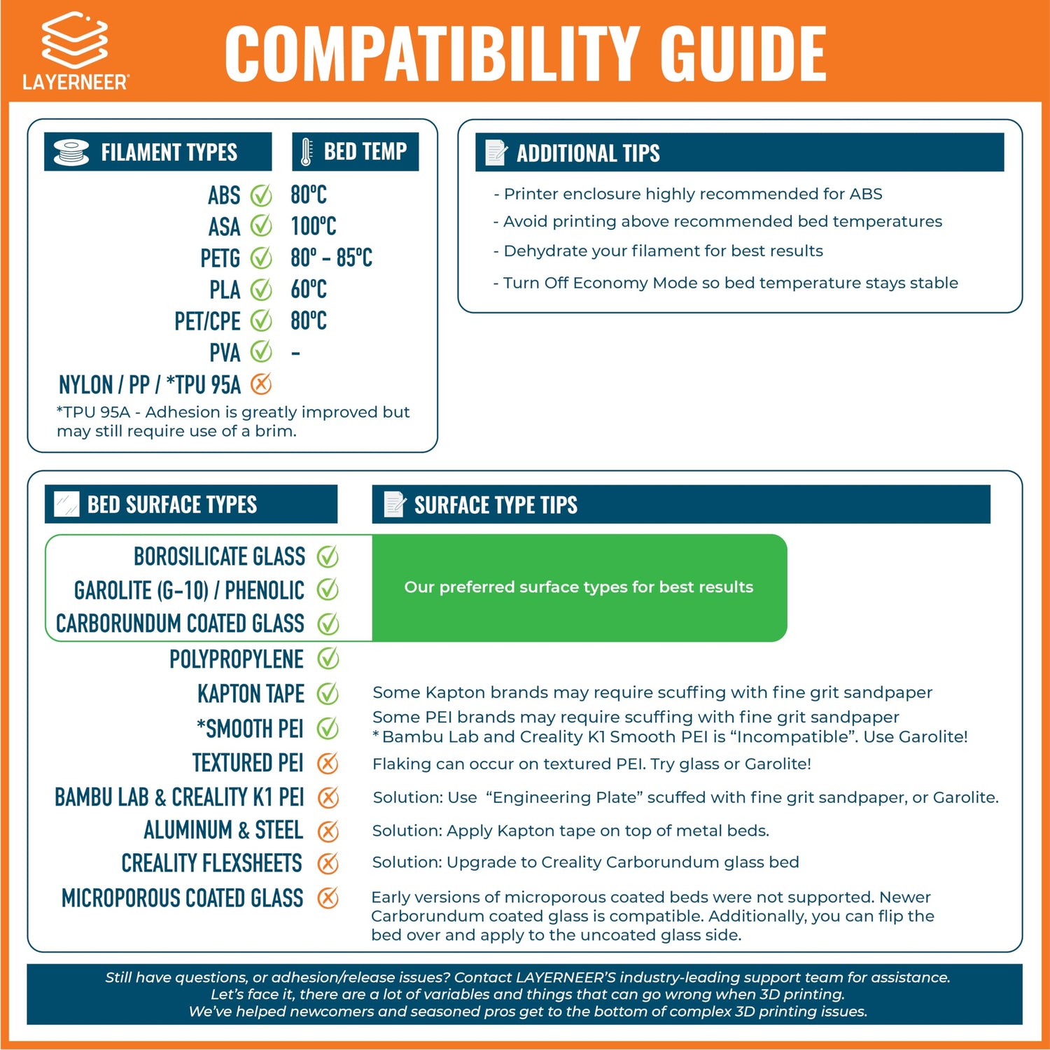 Works with PLA, ABS, PETG, ASA, and CPE filaments. BED WELD is not recommended for use with Nylon, PP, or TPU 95A.