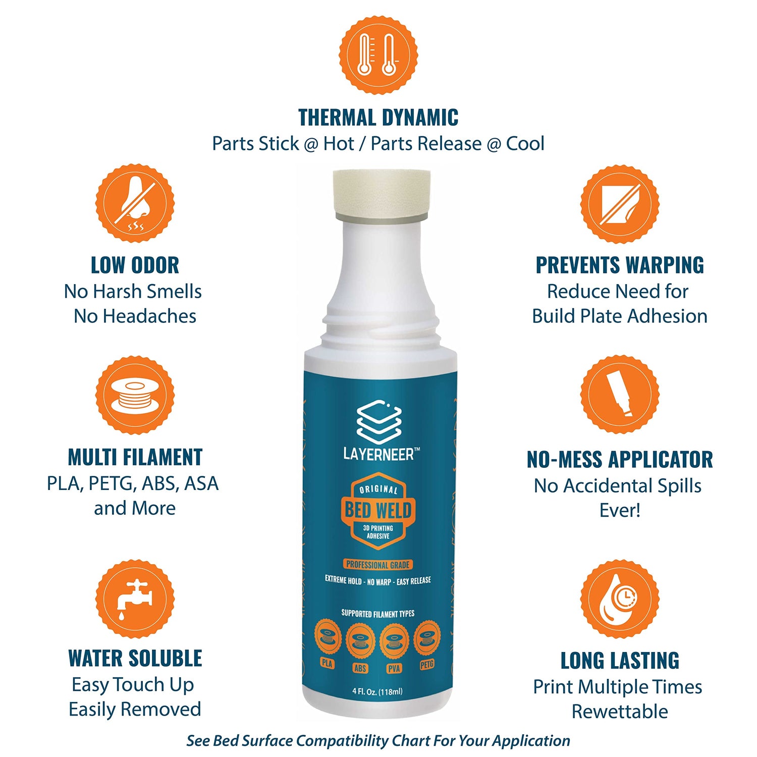3D Printer Adhesive Glue Bed Weld Original, Strong Grip Reduces Warping for ABS, ASA, PLA, and PETG Filament on Compatible Build Plates, 118ml, 4 fl oz