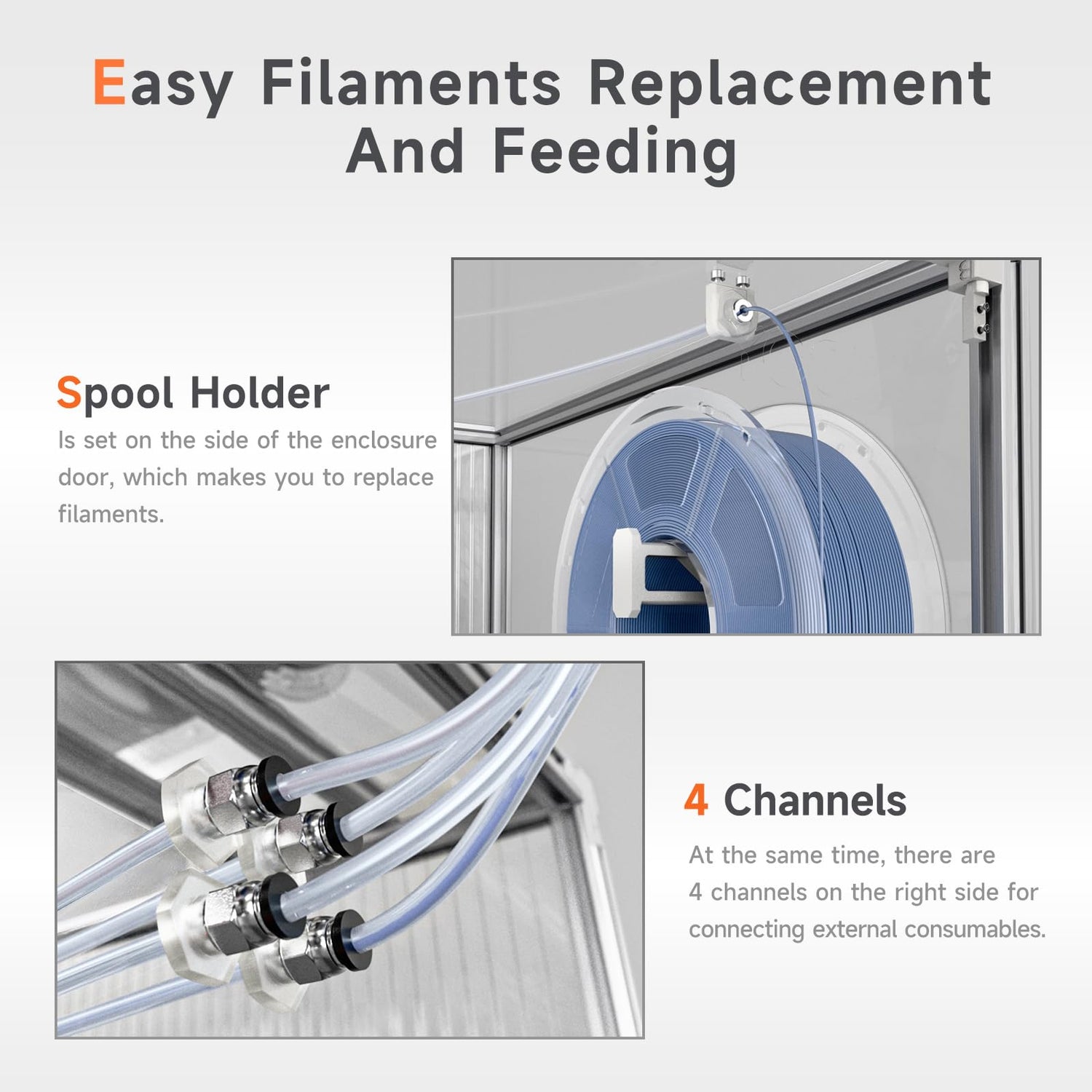 - 【Easy Filaments Replacement and Feeding】We have designed two ways to replace filaments for the A1 mini printer. One is that you can place your filaments through the built-in spool holder, which is located next to the door, making it easier for you to replace filaments than before.The other is that you can connect an external AMS lite through the 4 small holes on the right side.