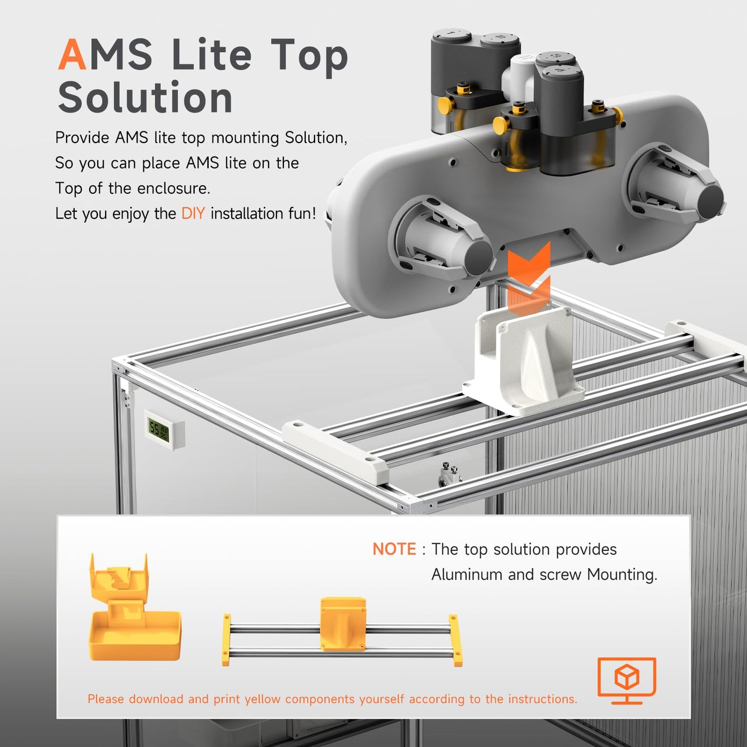- 【AMS Lite Top Solution】Supports installing your AMS lite on the top of the enclosure! Save space and better solve your AMS lite placement problem. Note: We provide AMS lite top mounting brackets and screws, and some parts need to be downloaded and printed by yourself. You can choose your favorite color to print the parts and enjoy the DIY fun!