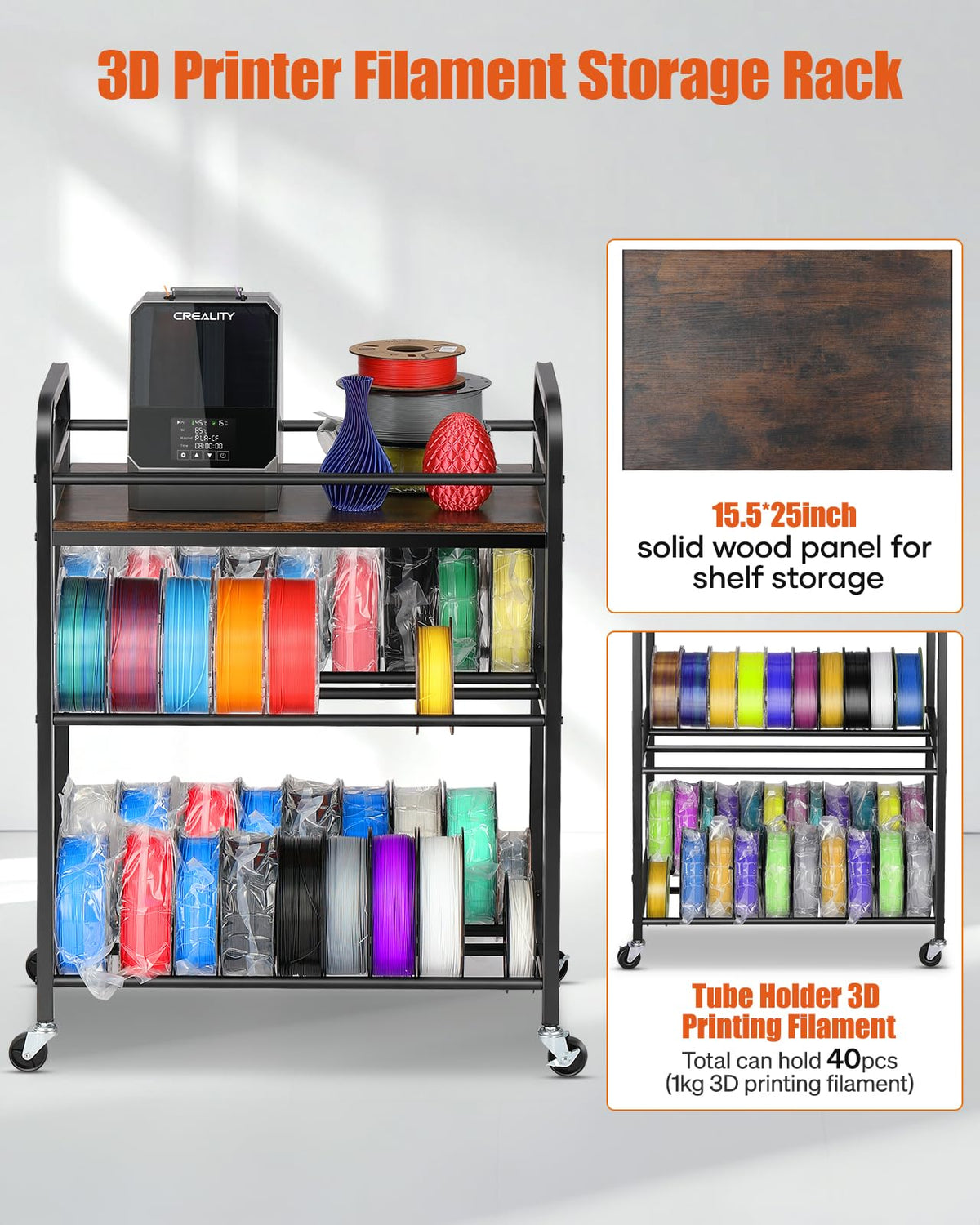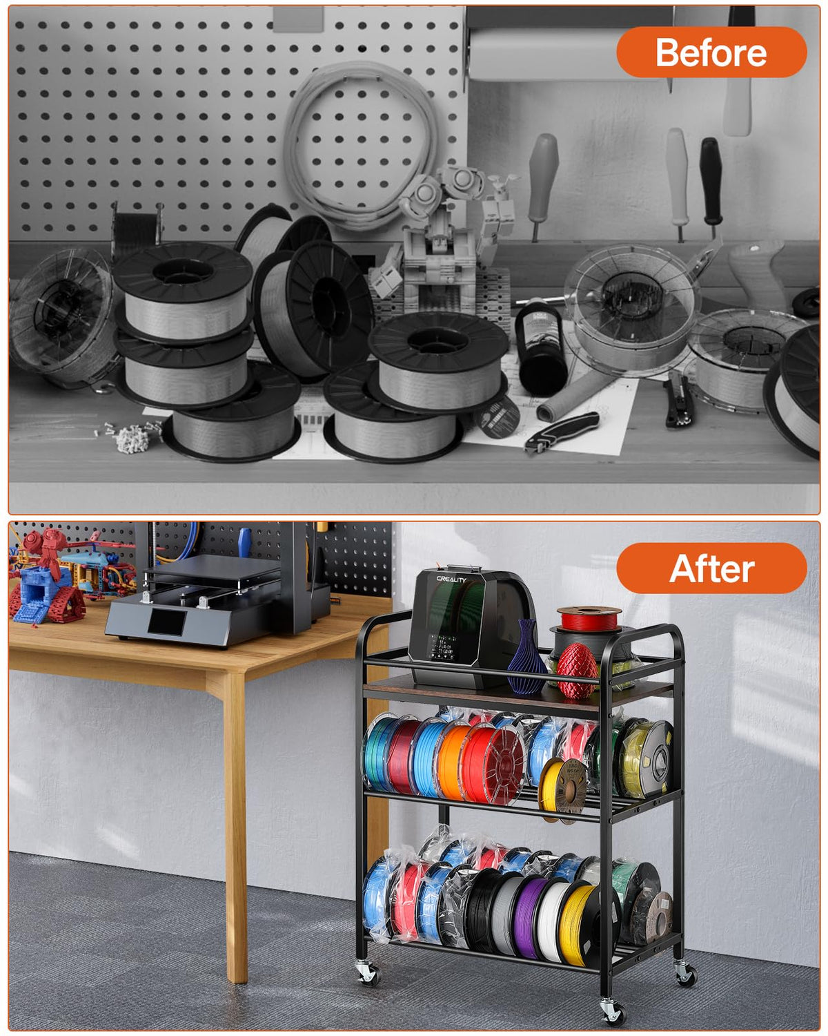 - Ample Storage for 3D Filament Spools: Specifically designed for 3D printing filament spools, including 300g, 500g, and 1kg sizes, with a maximum capacity of up to 40 spools of 1kg each. It offers ample storage space to neatly organize and store multiple spools, keeping your workspace tidy.