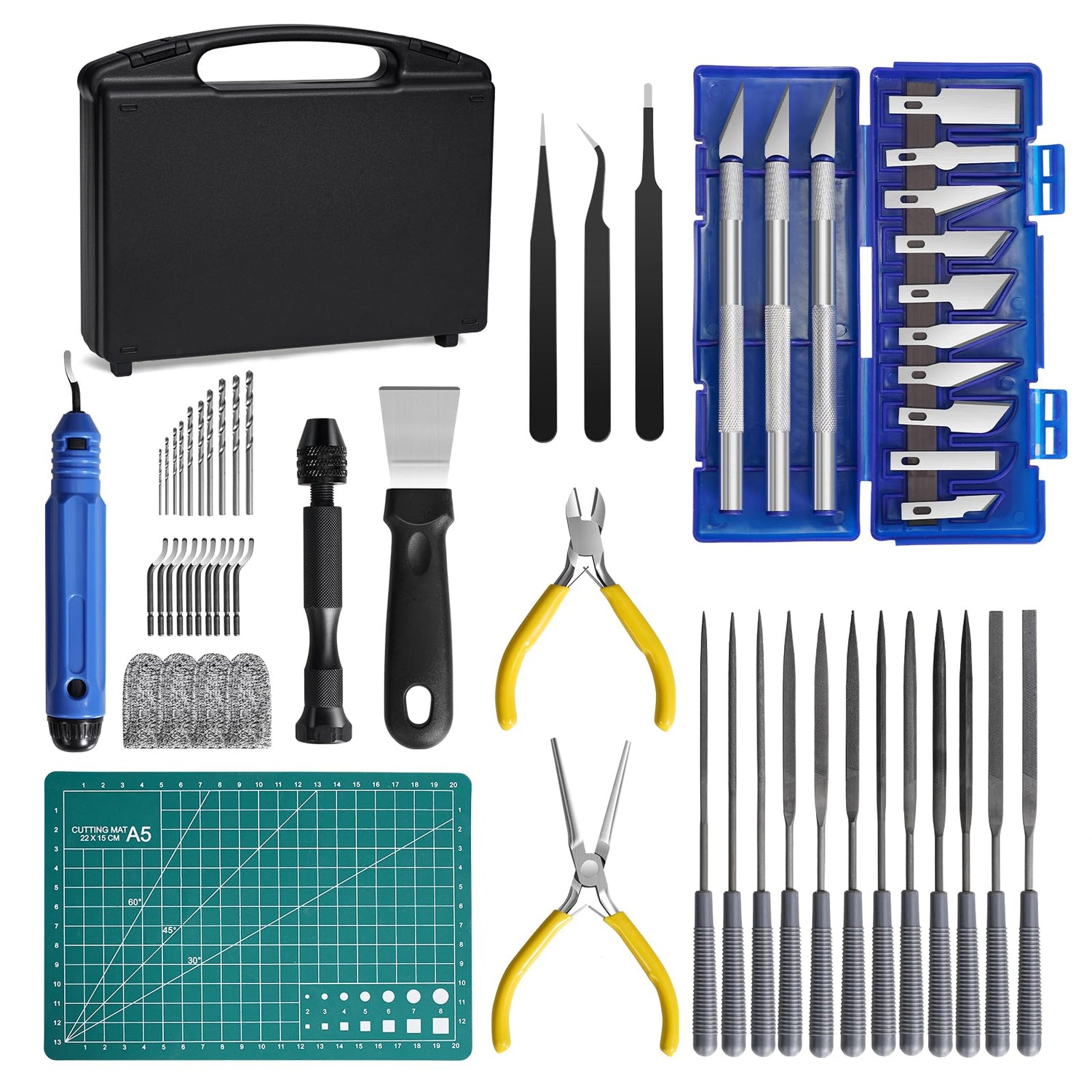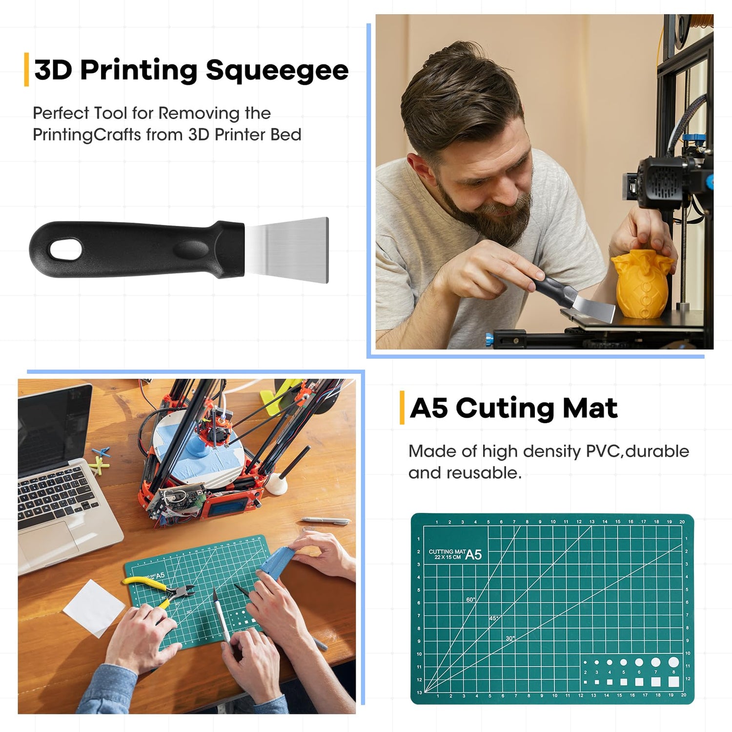 - 【58Pcs 3D Printer Tools Kit Includes】: 1 x Deburring Tool Handle set, 10 x Files ,3 x Tweezers,3 x Craft Knife set , 1 x Pointed-Nose Plier ,1xWire Cutterr ,1 x 3D Printing Squeegee,1 x Cuting Mat, 1 x Hand Drill set, 4 x Finger Cuff and 1x Storage box.