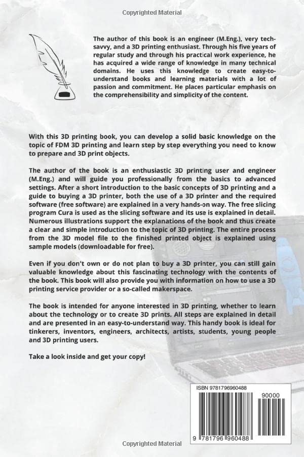 The book is intended for anyone interested in 3D printing, whether to learn about the technology or to create 3D prints. All steps are explained in detail and are presented in an easy-to-understand way. This handy book is ideal for tinkerers, inventors, engineers, architects, artists, students, young people and 3D printing users. The content of the book is reduced to the essentials. On about 60 pages, all the important information for beginners is provided.