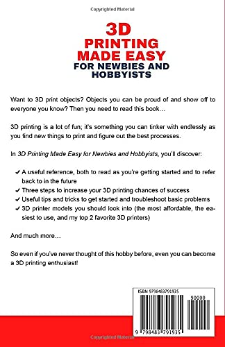 In the book 3D Printing Made Easy: For Newbies and Hobbyist, you’ll discover: A useful reference, both to read as you’re getting started and to refer back to in the future Top must-have 3D printer accessories (Chapter 3) Three steps to increase your 3D printing chances of success Useful tips and tricks to get started and troubleshoot basic problems How to find the right filament (printing material) for your printer 3D printer models you should look into (the most affordable, the easiest to use, and my top 2 favorite 3D printers)