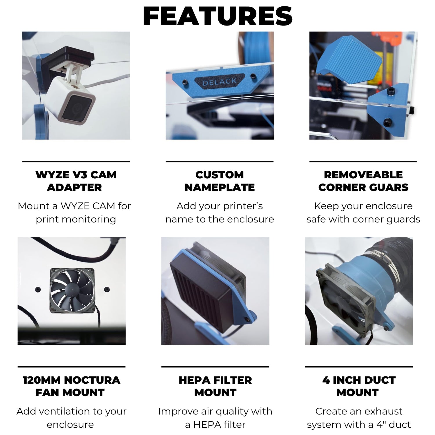 - VENTILATE YOUR SPACE WITH 120MM FANS & HEPA FILTERS - The DELACK Enclosure is compatible with 120mm fans for ventilation as well as multple accessories for ventilation including a HEPA filter and an air duct adapter. If you prefer to print without a fan, a part can be printed to cover the cutout at the back of the 3D printer enclosure.