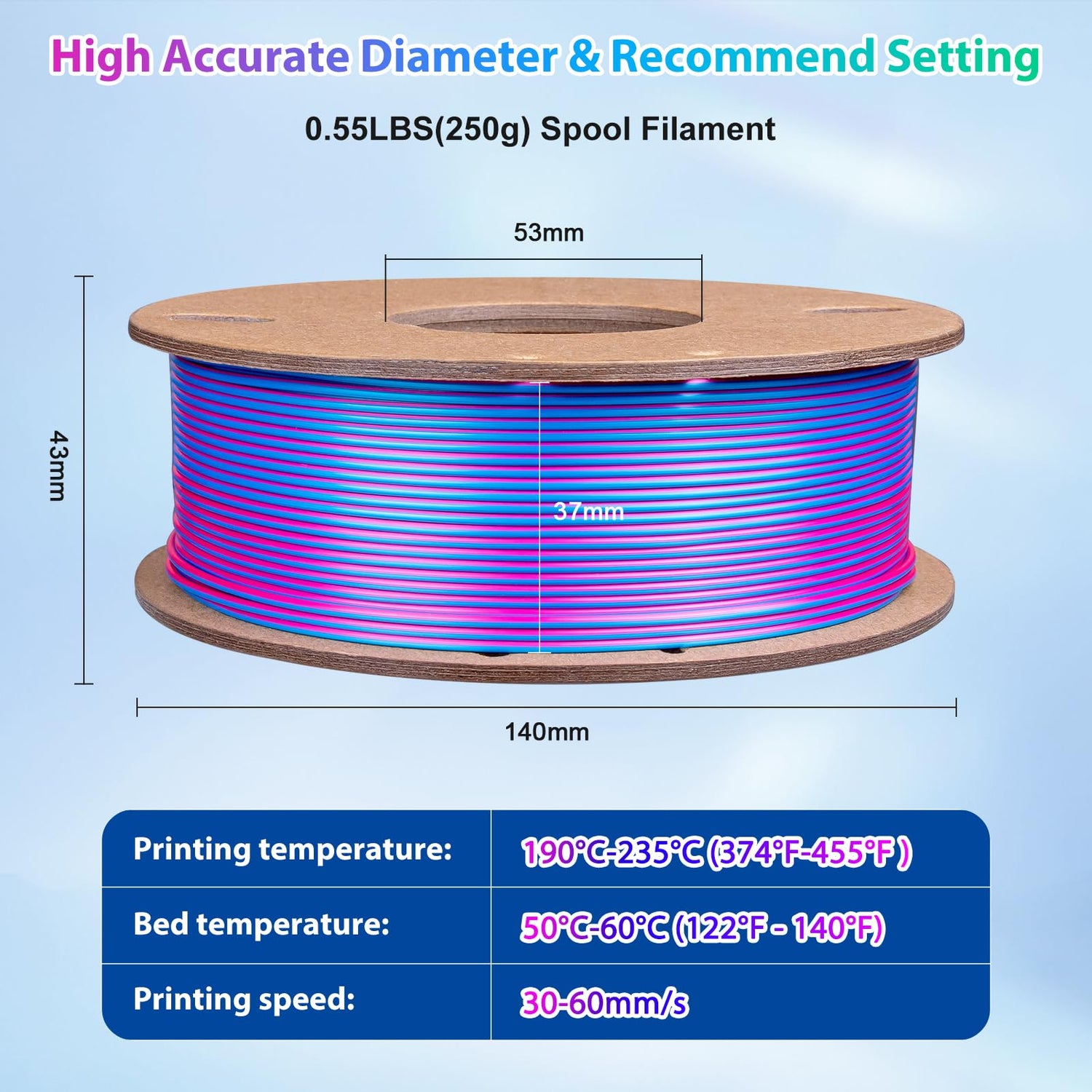 - WIDE COMPATIBILITY & PRINTING TIPS: The silk pla filament is 250g/0.55lbs. 3Dgenius 3d printer Filament is compatible perfectly with most FDM 3D Printers that use 1.75MM filament on the market, such as Prusa, Makerbot, MK3, Ender 3 and more. Recommended Extrusion/Nozzle Temperature 190°C - 235°C (374°F - 455°F). Bed/Platform temperature 50°C - 60°C (122°F - 140°F). Print Speed: 30-60mm/s.