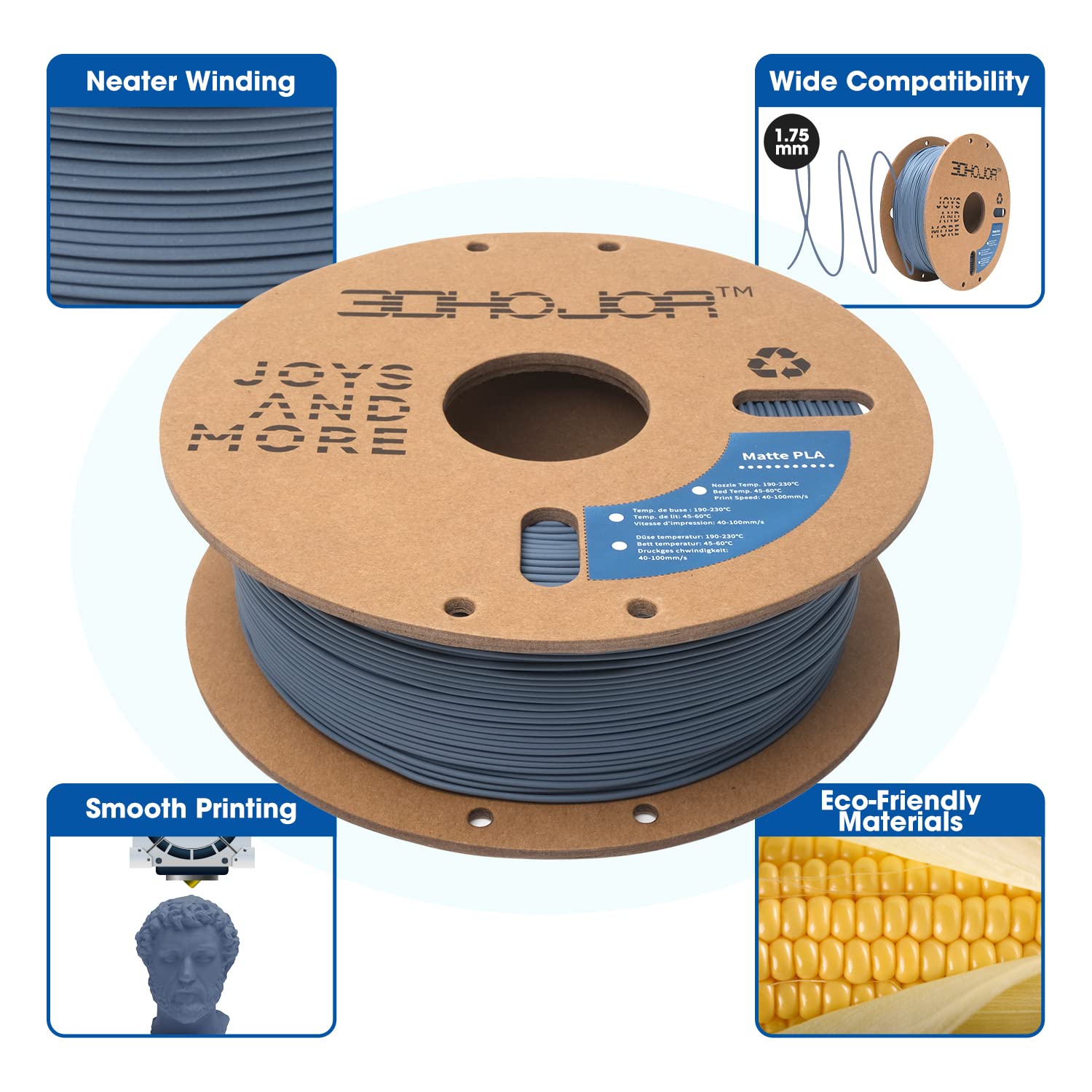 - 【Matte Finish】3DHoJor Matte PLA Filament 1.75mm,matte finish which helps hide the layers of your print,bed adhesion and extrusion output has been significantly improved. Matte PLA filament can be used to make prints with shine-free and frosted texture.
