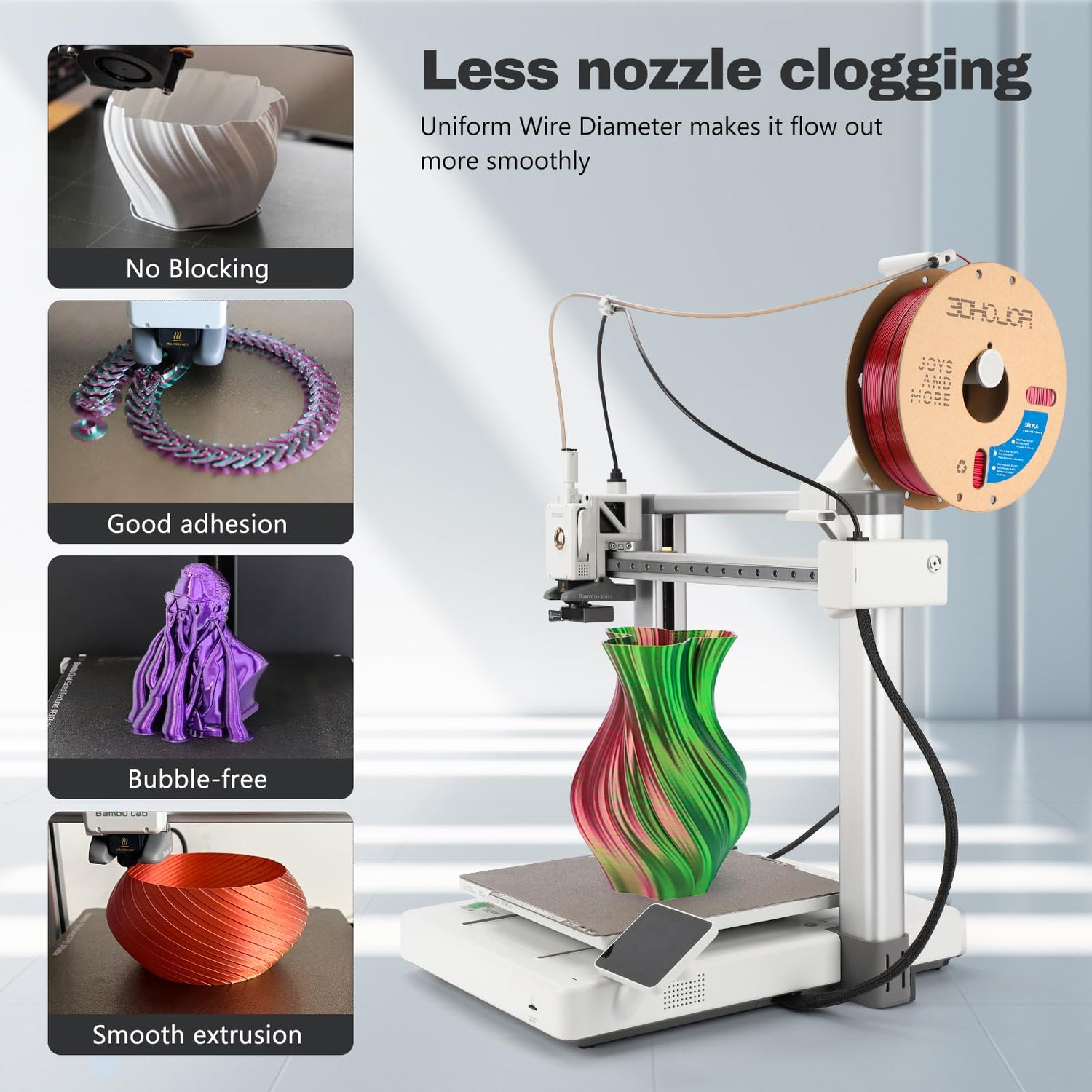 - 【Silk Dual Color PLA】You can get a gorgeous 3D printing surface. Shiny Silk Red Green combination of magic 1.75mm PLA filament, make the two sides of your print appear in different colors. Every inch has has two colors. This gives your prints not only a smooth and shinny appearance, but also a unique color pattern and effect.