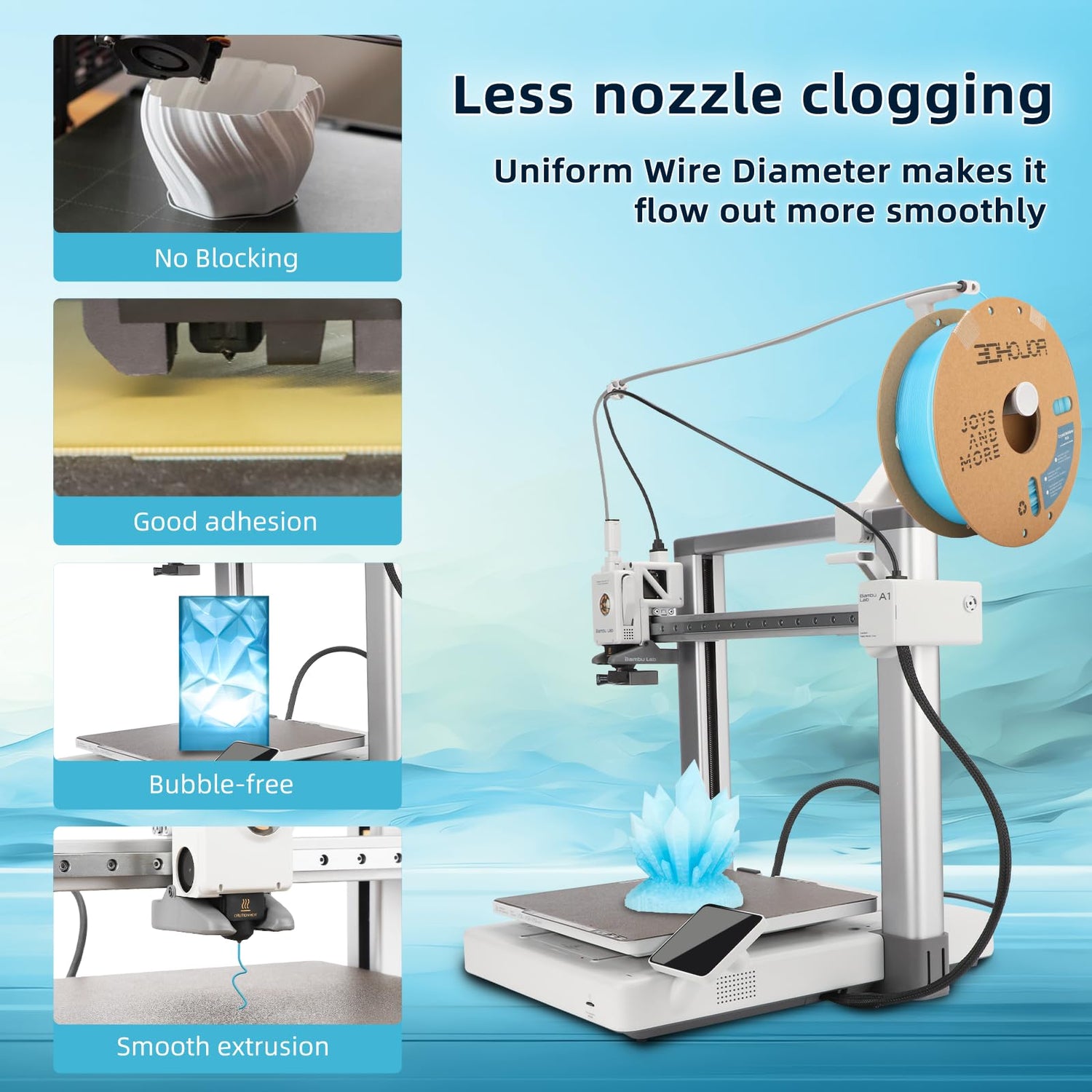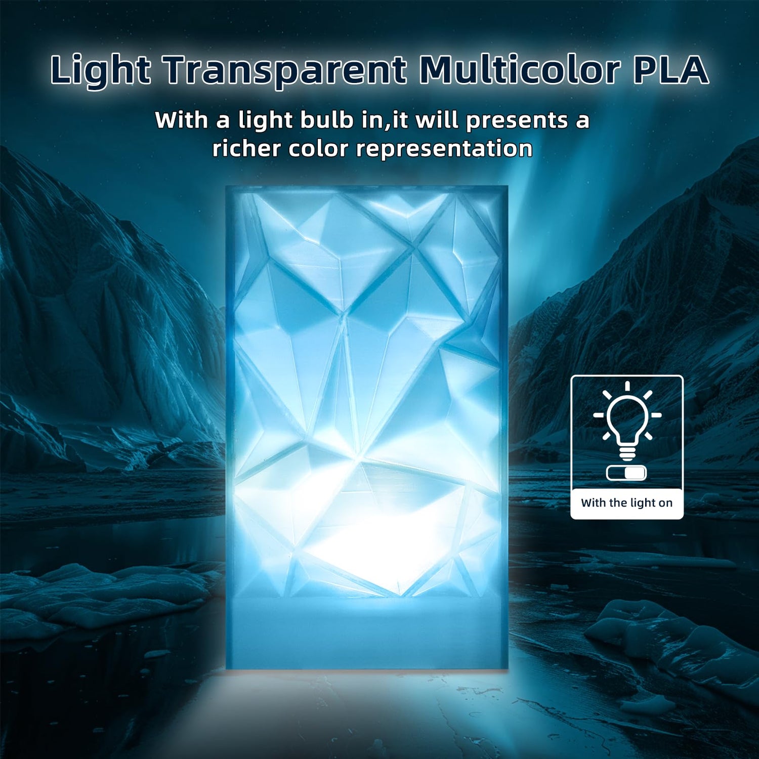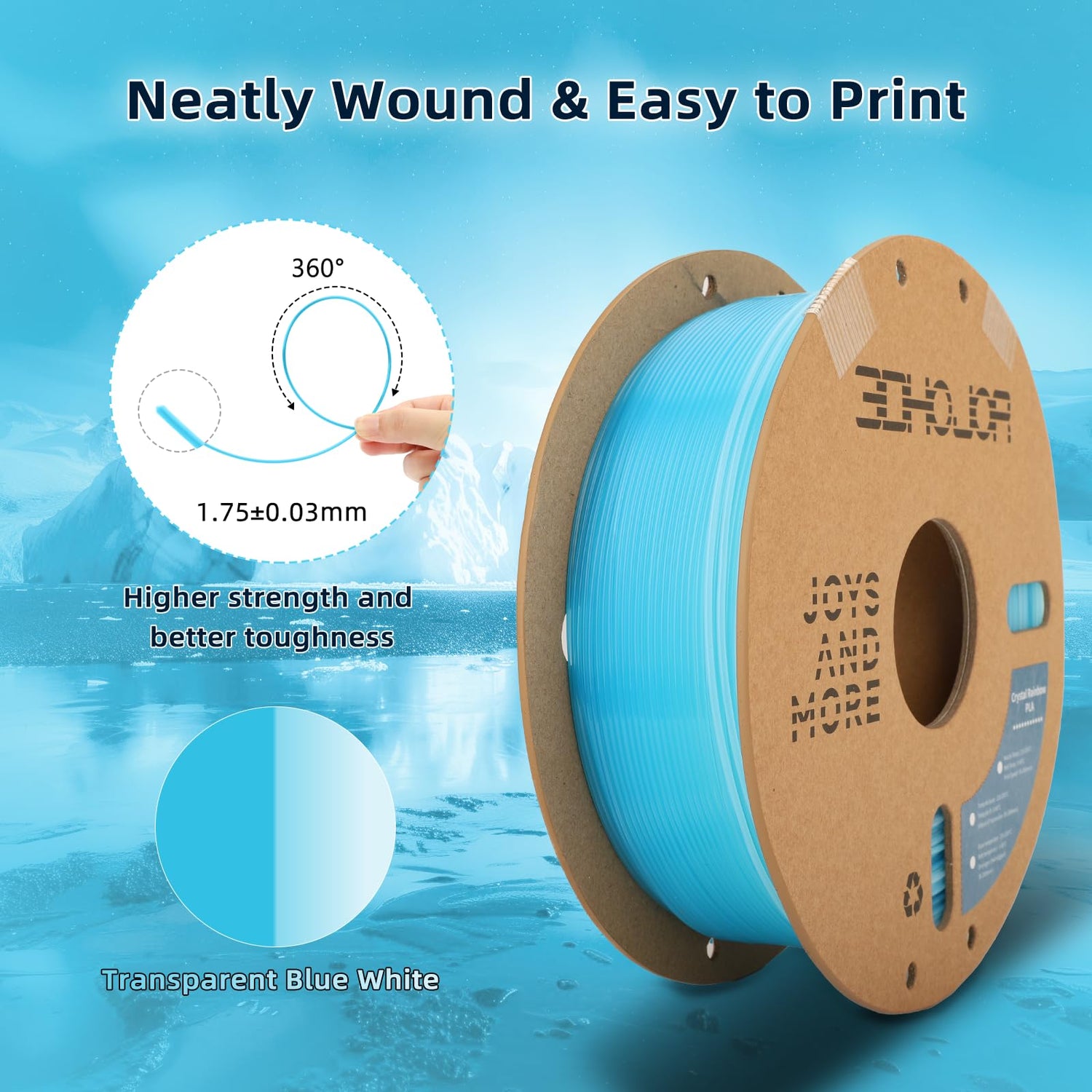 - Multicolor transparent PLA Filament: Multicolor color changing mixed in one spool filament and presents a rich visual aesthetic. You just need print about 100g and it shows all colors. Transparent Blue and white color combination is clear and pure.