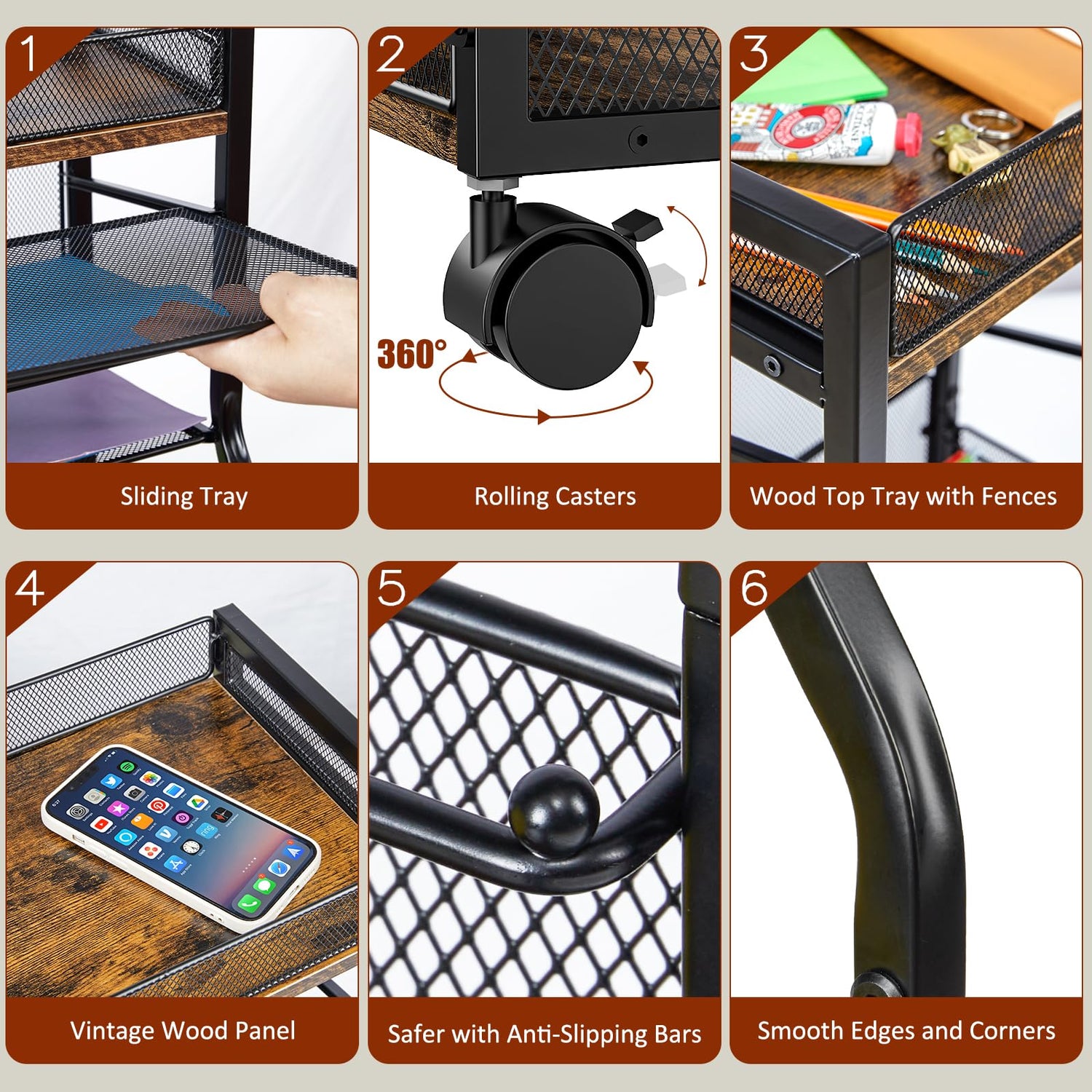3IngSeagulls 5-Tier Rolling File Cart with Hanging File Folders, Mobile Desk File Organizer on Lockable Wheels, Wood & Mesh Paper Letter Sliding Trays Organization for Office, Home, School, Patent