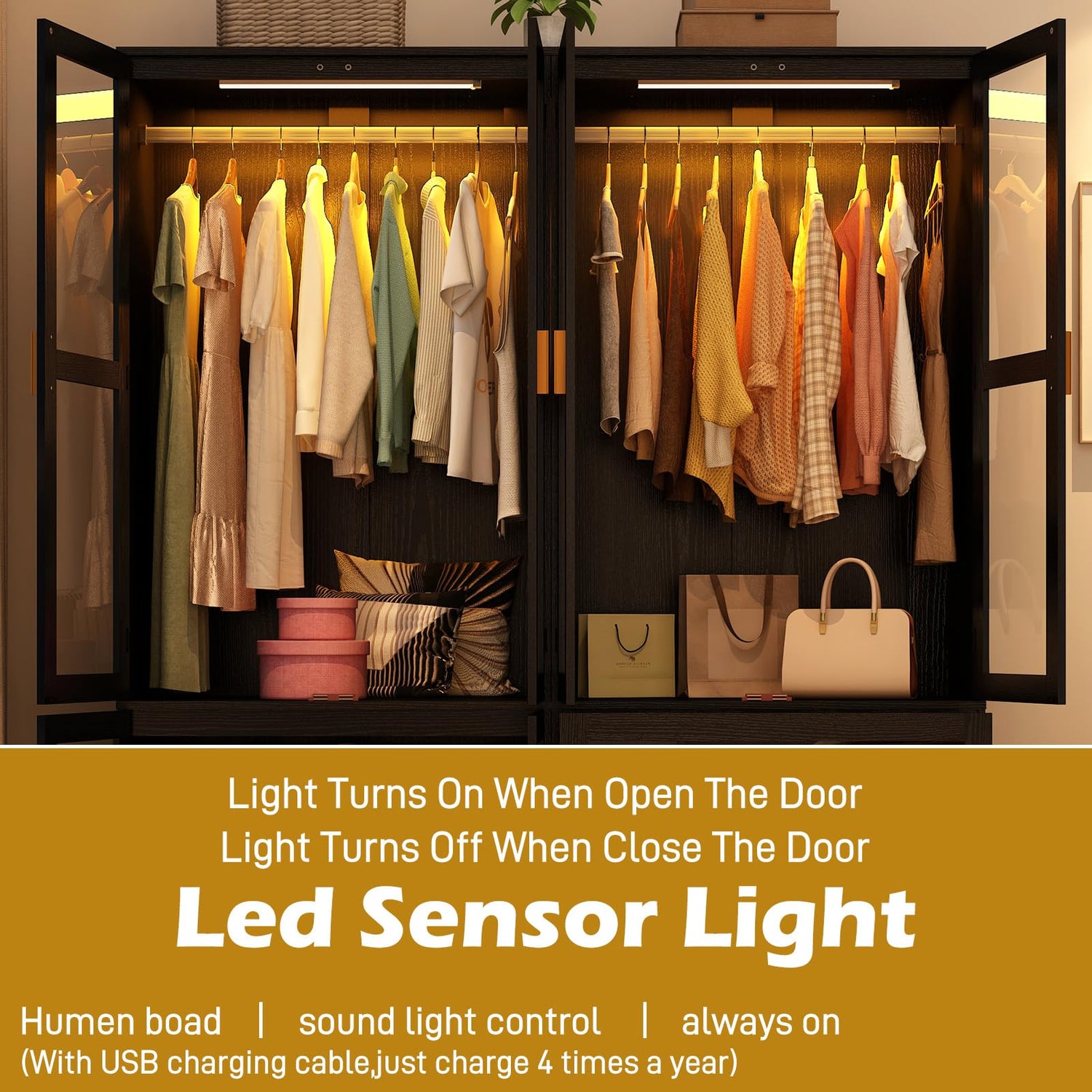 - Armoire Wardrobe Closet with LED:this 71" freestanding wooden wardrobe closet cabinet for bedroom Equipped with human body intelligent induction light, the door light turns on when opened and turns off when it is closed the door. The induction range is within 5 meters, so you can easily find clothes at night.The LED light is charged via the included USB charging cable and can be used for 3-5 months on a single charge.