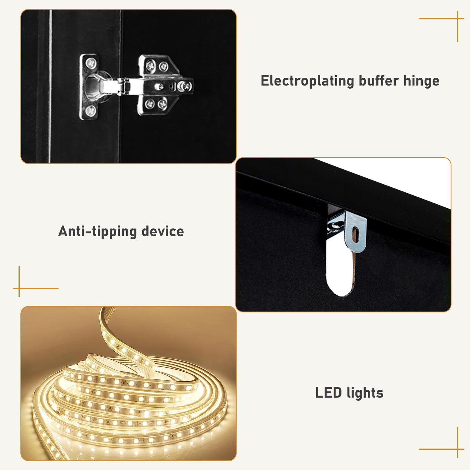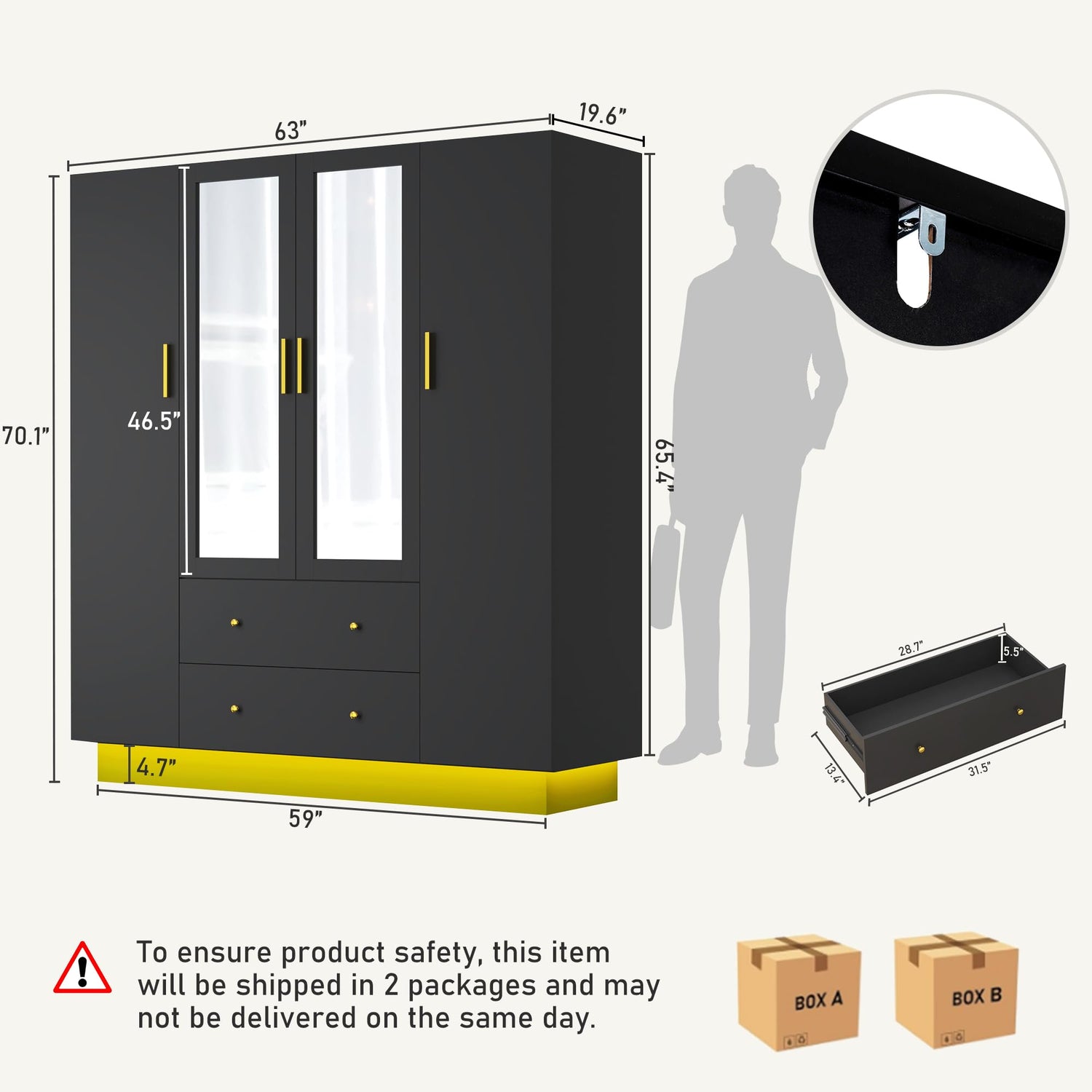 4 Doors Armoire Wardrobe Closet with Mirror, LED Armoire with Doors and Drawers, Wooden Wardrobe Storage Cabinet with Hanging Rod, Adjustable Shelves, Black