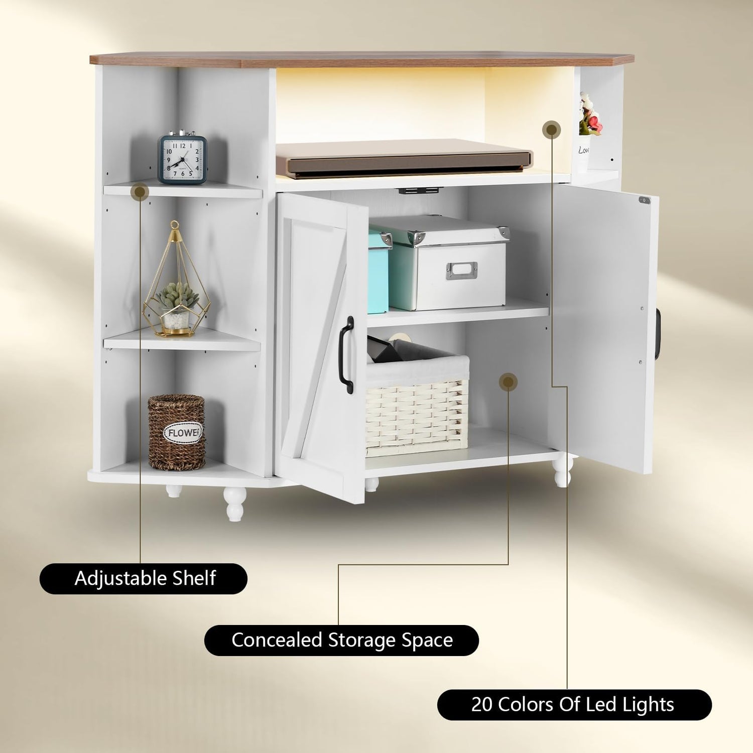 - Modern Farmhouse Style and Lighting Aesthetics: Combination of corner TV cabinet and wood textured tabletop panels is an aesthetic balance. Barn door design enriches the farmhouse style for corner. Colorful LED lights of corner cabinet with doors controlled easily to match different atmospheres for living room