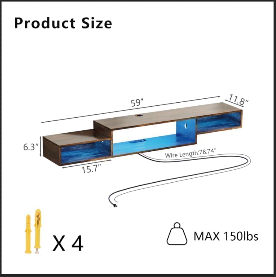 - POWER OUTLET and LED LIGHTS: Our floating tv cabinet has 2 standard 3-hole plugs and 2 USB ports for charging TV, DVDS, WiFi routers and more.Unique blue lighting and rustic browns add mood to your bedroom and living room
