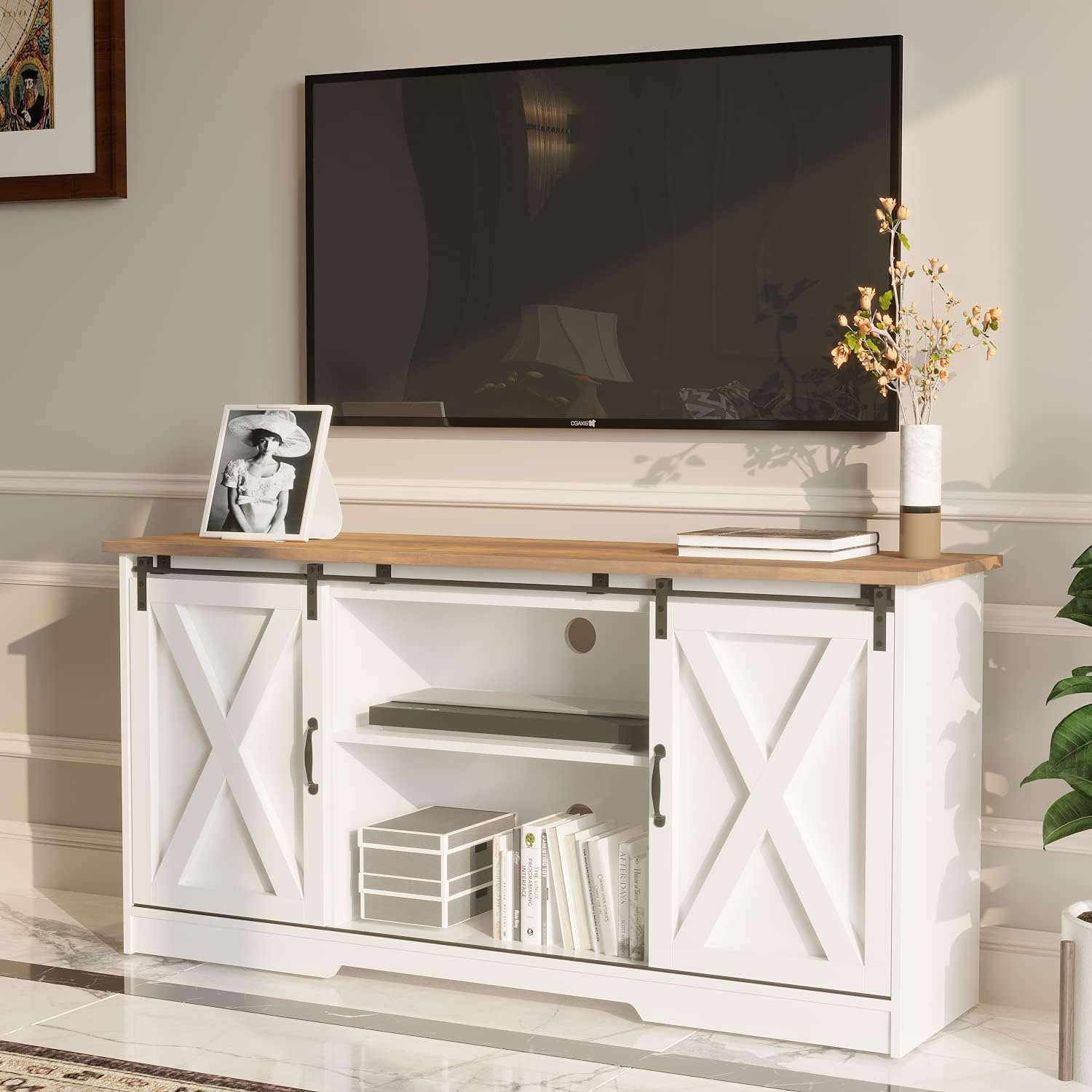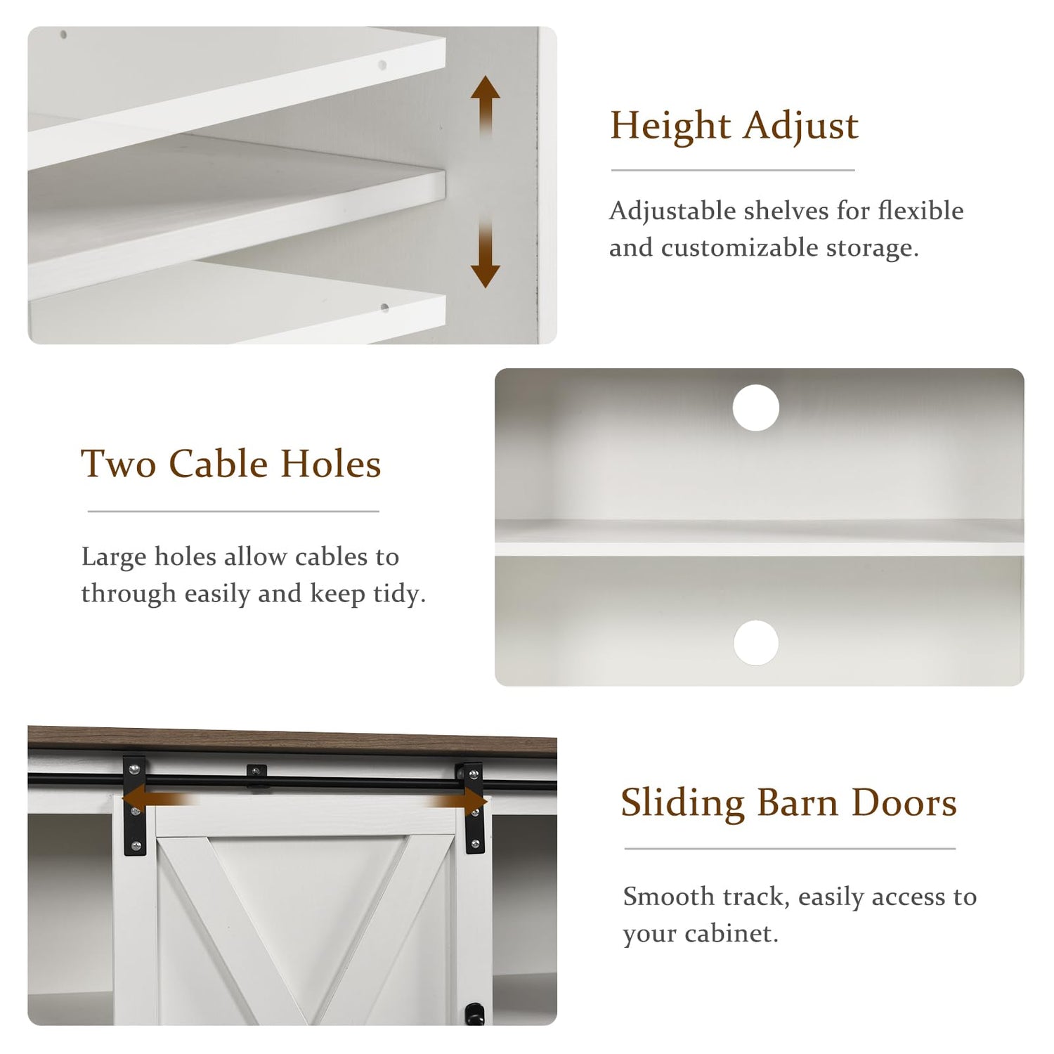 - Classic Farmhouse Aesthetic Design - The farmhouse style white TV stand features exquisite sliding barn doors, creating a warm, nostalgic, and timeless atmosphere for your living room. Whether you do actually live on a farm or are based in the middle of a bustling city, you can appreciate the cozy elements of farmhouse style.
