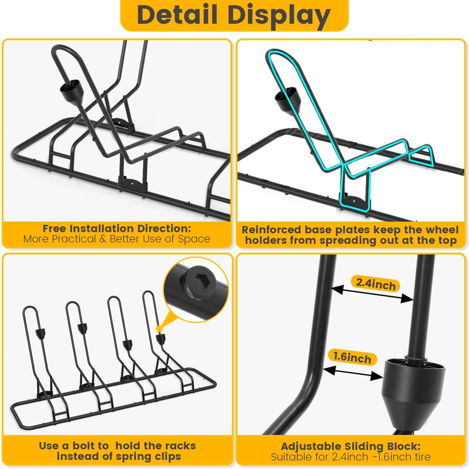 - Heavy-Duty Upgraded Steel Frame for Enhanced Stability: Built with 0.63" thick steel tubes (upgraded from 0.47") for superior strength. This floor bike rack securely holds up to 4 bikes (12"–29", max 2.4" wide) for indoor or garage storage