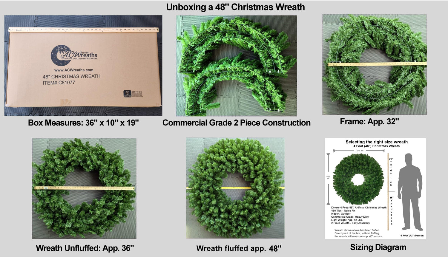 - Shaping the branches after removing the wreath from the box will bring it to it's full shape and beauty. After shaping, the coverage area will be app. 44".