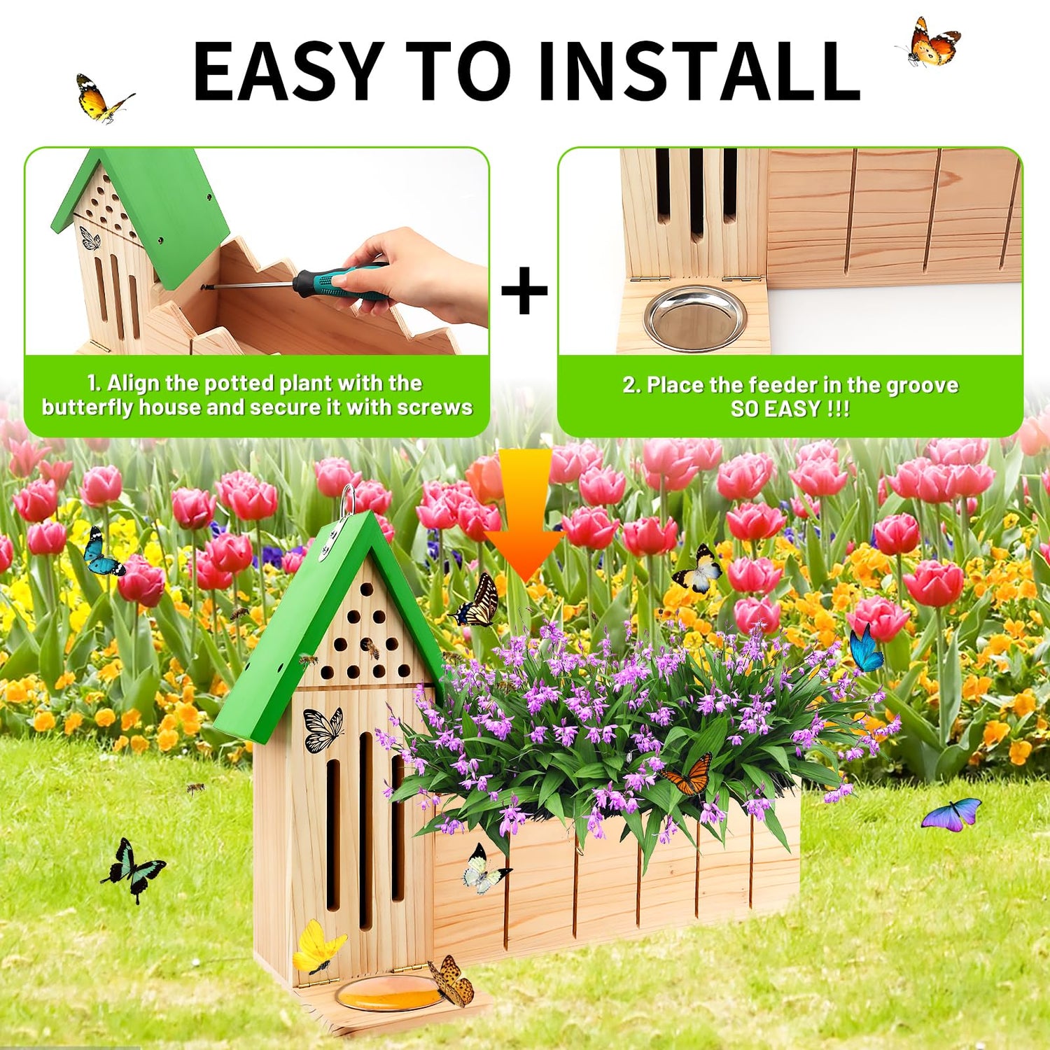 4-in-1 Butterfly House Feeder Bee House with Flower Pot, Wooden Butterfly Houses for The Garden, Butterfly Feeders for Outdoors, Natural Butterfly Garden Kit Habitat for Outside