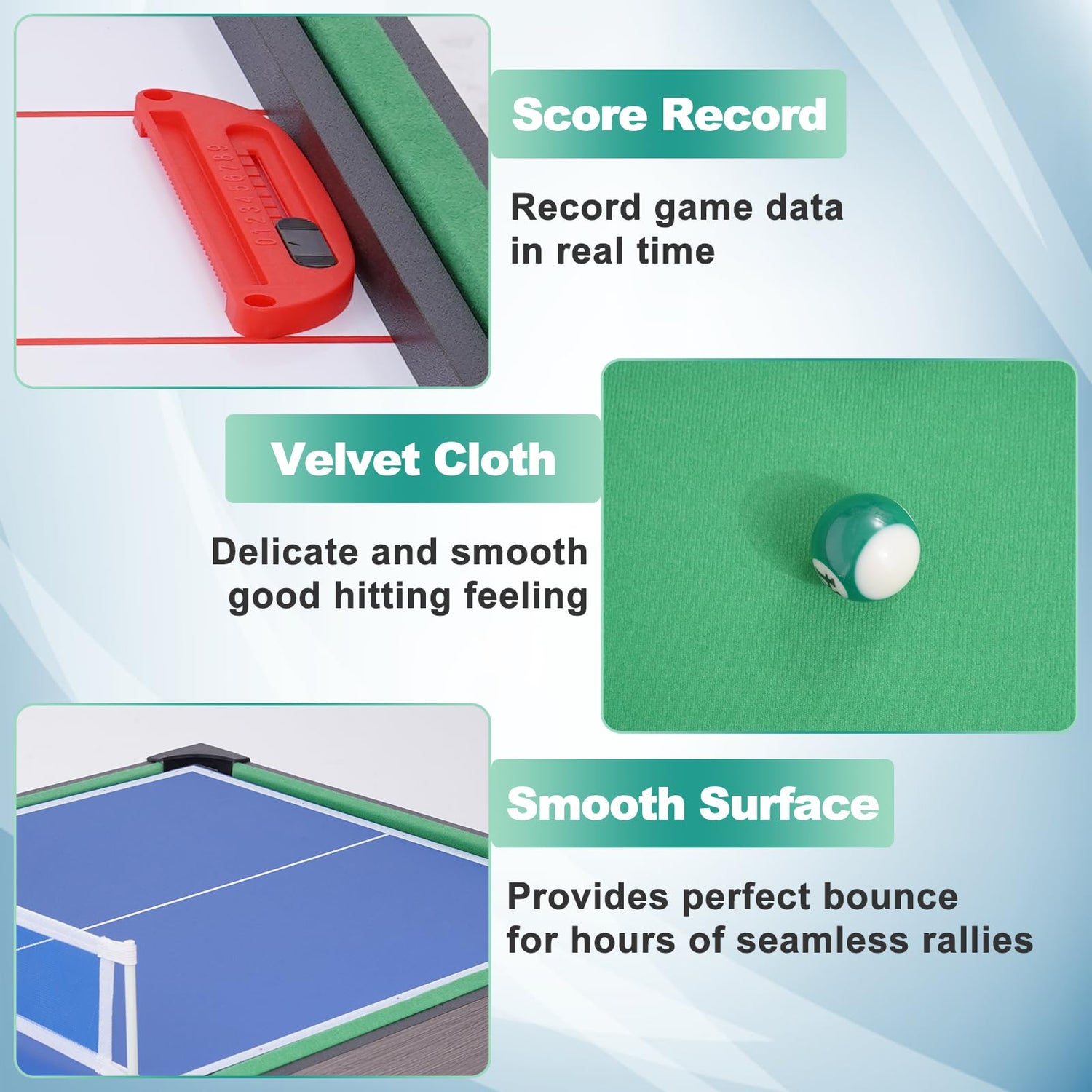 - 【Realistic Gaming Experience】RAYKEEP combination game tables bring you an immersive gaming experience. Comes with realistic players, a scoreboard, and comfortable handles. At the same time, the durable billiard felt, convenient collection ball net bag, and tabletop competition pattern also make the game real, tense, and fun.