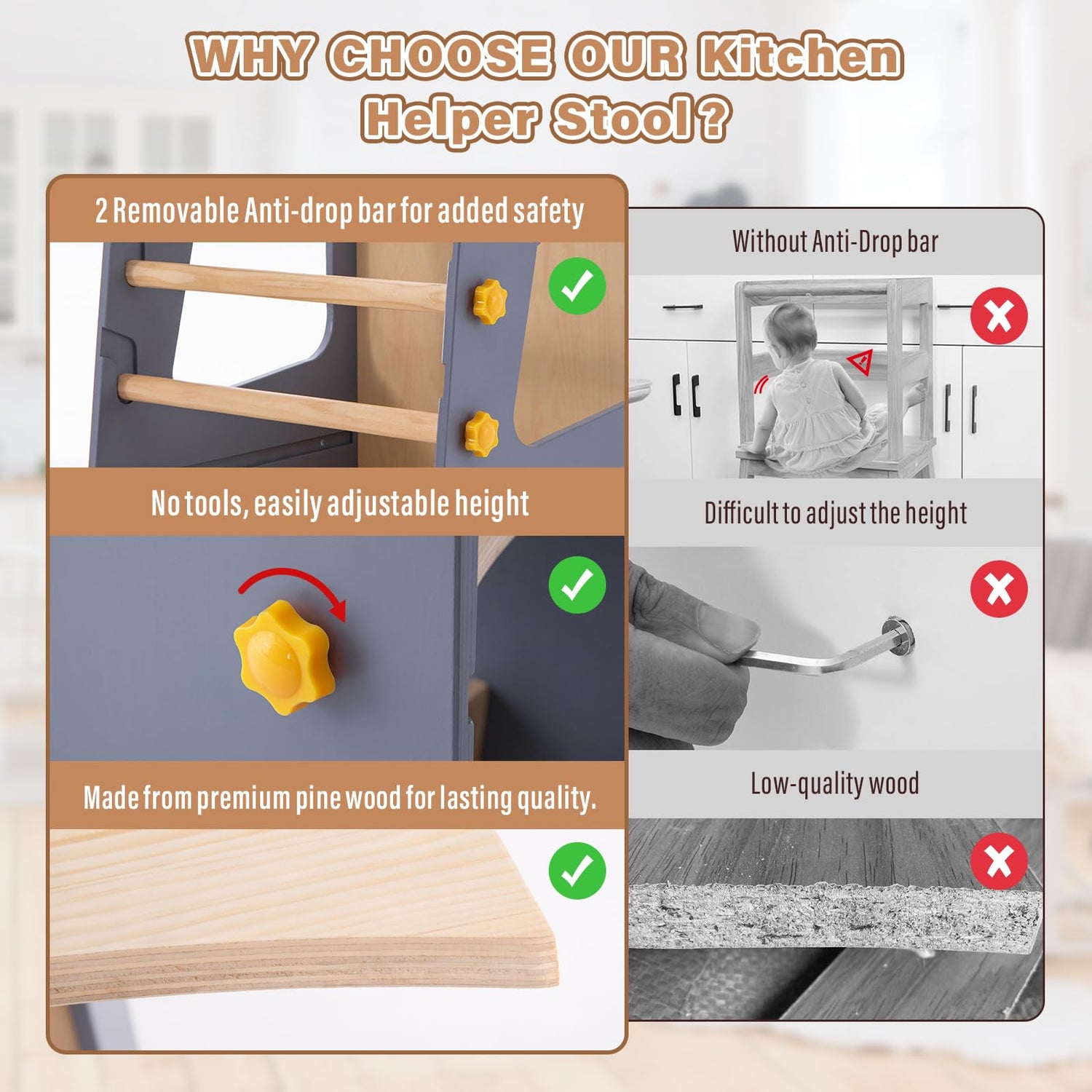 - 【Adjustable Heights and Easy to Clean】:Ideal for kids aged 18 months to 6 years, our Learning Toddler Step Stool features two adjustable height levels (38" and 45"), ensuring it grows alongside your child and provides years of independence and enjoyment. With a robust weight capacity of 165 lbs, it offers reliable stability and safety. Its daily maintenance is easy—if there are stains, you can simply wipe the wood toddler kitchen step stool with a rag.