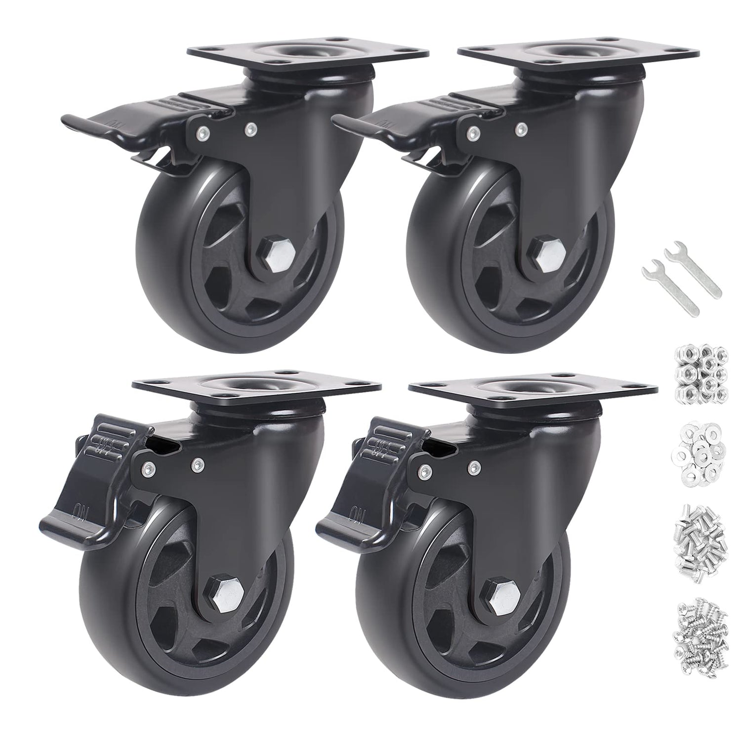 Details: SpecificationsColor:BlackMaterial:PVC and steelWheel Diameter: 4-inch/ 100mmWheel Width:32mmPlate Size:92mm*63mm/3.62’’*2.48’’Mounting Height:135mm/5.31’’Hole Distance:75mm*35mm/3’’*1.38’’Mounting Hole Diameter:8mm/0.31’’Bearing: Double ball bearingsCapacity LBS: 2000 Lbs (500Lbs each)Brake Type: Contacted brakeBenefits1.Smooth rolling and premium PVC materials can keep your floors protected form scratches with the YeMI Casters.2.Best Price On Amazon Highest Quality at Best Price on AMAZON.3.2000 LB max is strong enough to Support the entire Catering car, Push Cart,including all kinds of industrial equipment.4.This kind of brake on the wheels is different from others. It makes friction through the contact of the wheel, and thus effective braking.Where to use?All industrial equipment,especially for Catering car, Push Cart, Garden Cart ,Workbench and Table,even Piano etc.Our casters are safe for hardwood, tile, pergo, linoleum, laminate, bamboo, concrete, slate, marble & glass floors. Swift, smooth, and quiet gliding is what YeMI Casters do best.Package list:4 *Caster Wheel (with Brake)Note:All swivel caster wheels approved by SGS,BIFMA,ROHS.Dual Locking.When in locked position,the swivel also locked.