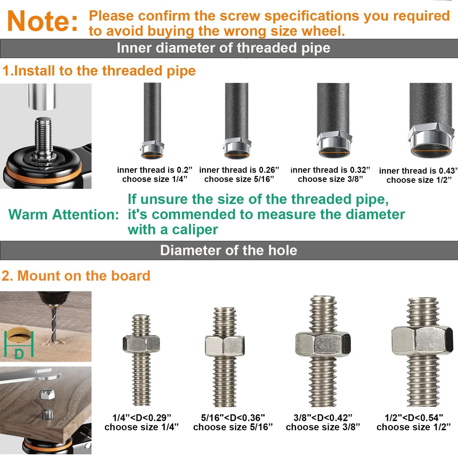 - STANDARD AMERICAN SIZE 1/2" -13UNC x 1": Please measure the stem size of your old thread dual locking caster wheel with Brakes before purchasing. Our cart wheels screw size is 1/2" -13x1" (Screw Diameter 1/2", Screw Length 1"). The castors are quickly attached to medium and large equipment like workbench, trolley, carts.