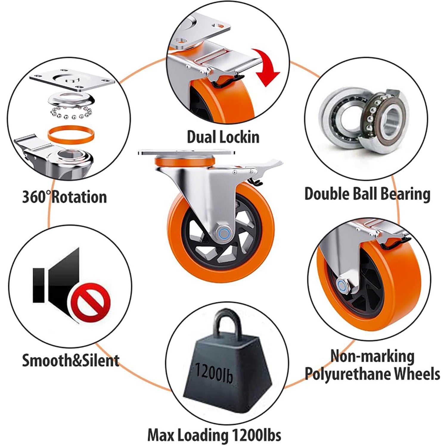 - HEAVY DUTY CASTERS: Thickened steel construction body, each caster can hold up to 300 lbs, with a total weight capacity of up to 1200 lbs (2PCS fixed casters,2PCS caster wheels with brake), and the double ball bearings make it very strong and durable