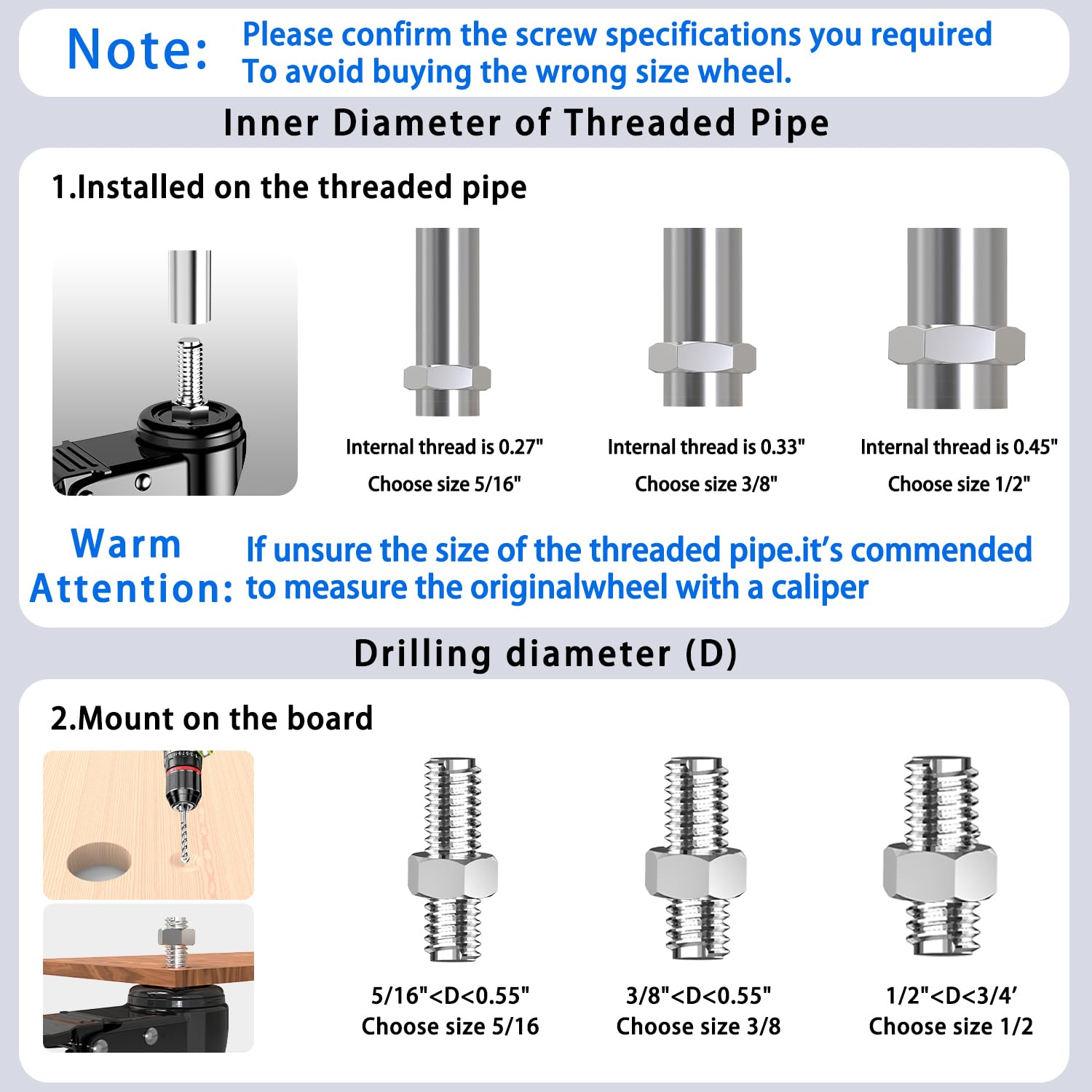 - CASTER SPECIFICATIONS : 4 inch Locking Swivel Casters, 1/2" -13UNC x 1" (Stem Diameter 1/2", Stem Length 1") threaded stem casters. Each no noise casters comes with free mounting hardware to help you assemble quickly. Please confirm the required screw specifications before purchasing 4 inch stem casters.