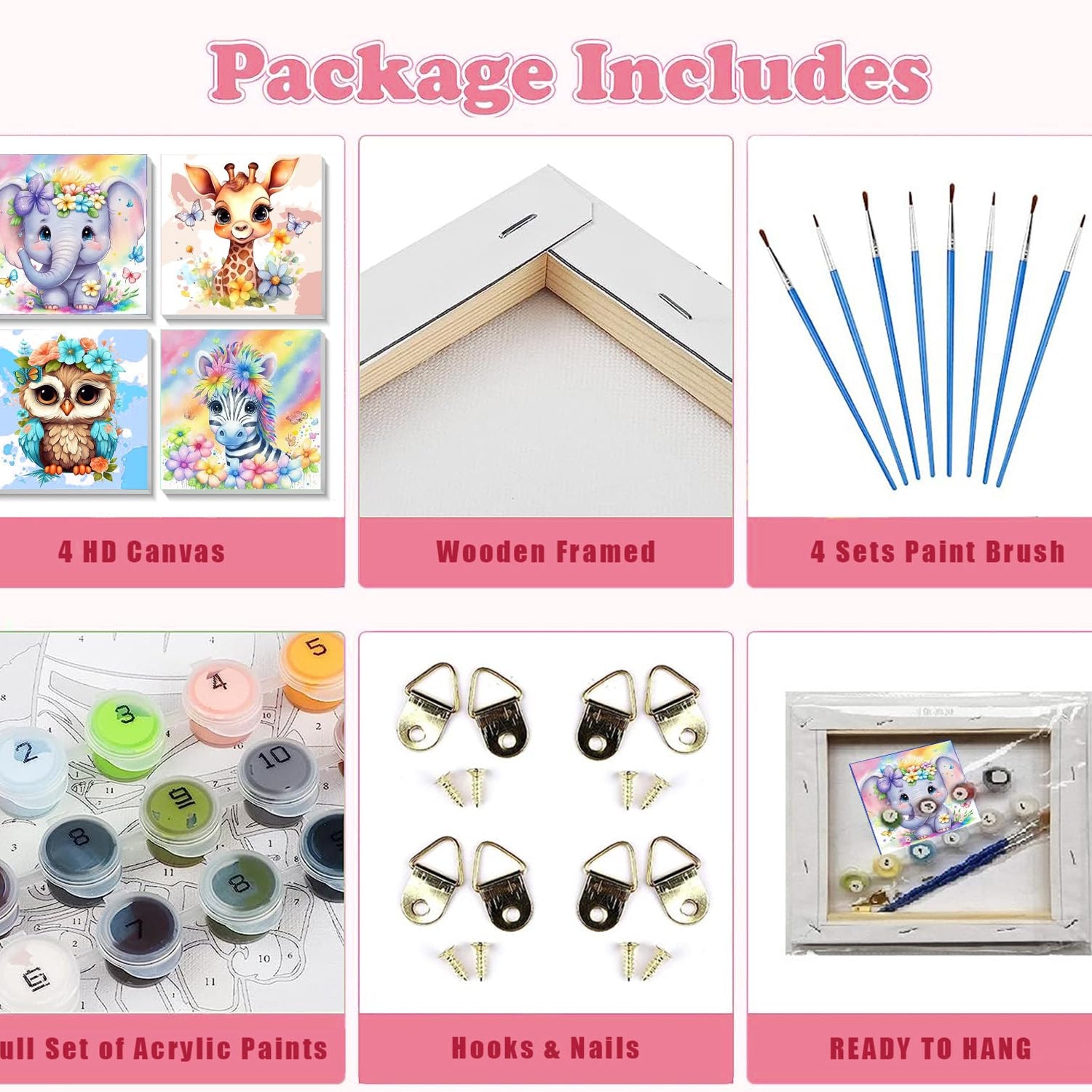 - 【What You Will Get】 Looking for a way to bring out your child's creativity or a way to relieve stress? Look no further than our Paint by Number 4-Pack! Each kit comes complete with a beautifully framed canvas featuring cartoon pattern, high-quality paint, and two brushes with different tips to help create the perfect work of art. We even provide Hooks for hanging their masterpiece as stunning wall decor. Get ready to cherish their art forever