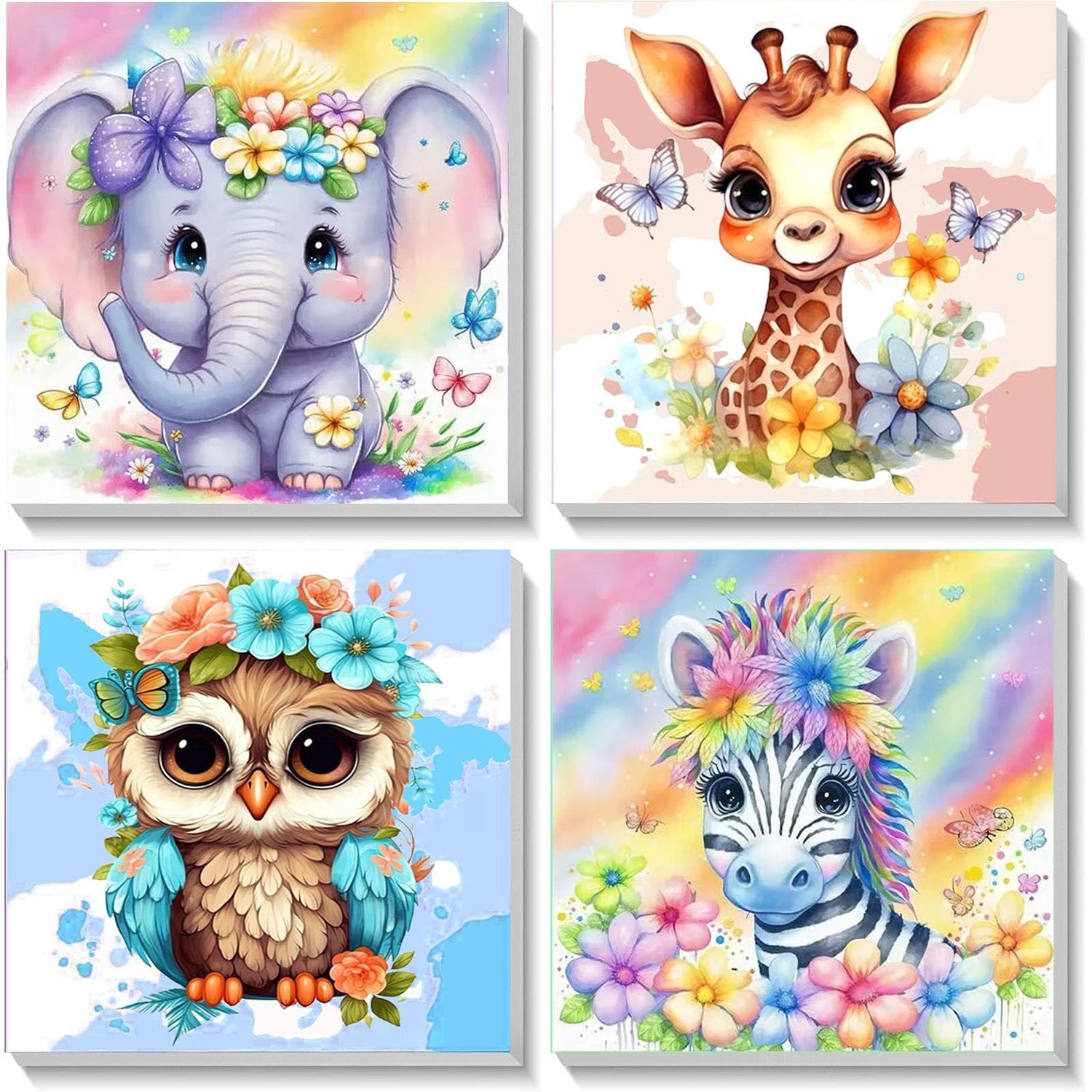 4 Pack Animal Paint by Number for Kids with Wooden Frame, Paint by Numbers for Kids Animals Ages 4-8-12, Easy Elephant Owl Giraffe Zebra DIY Acrylic Oil Painting Kits for Home Wall Decor (8X8 inch)