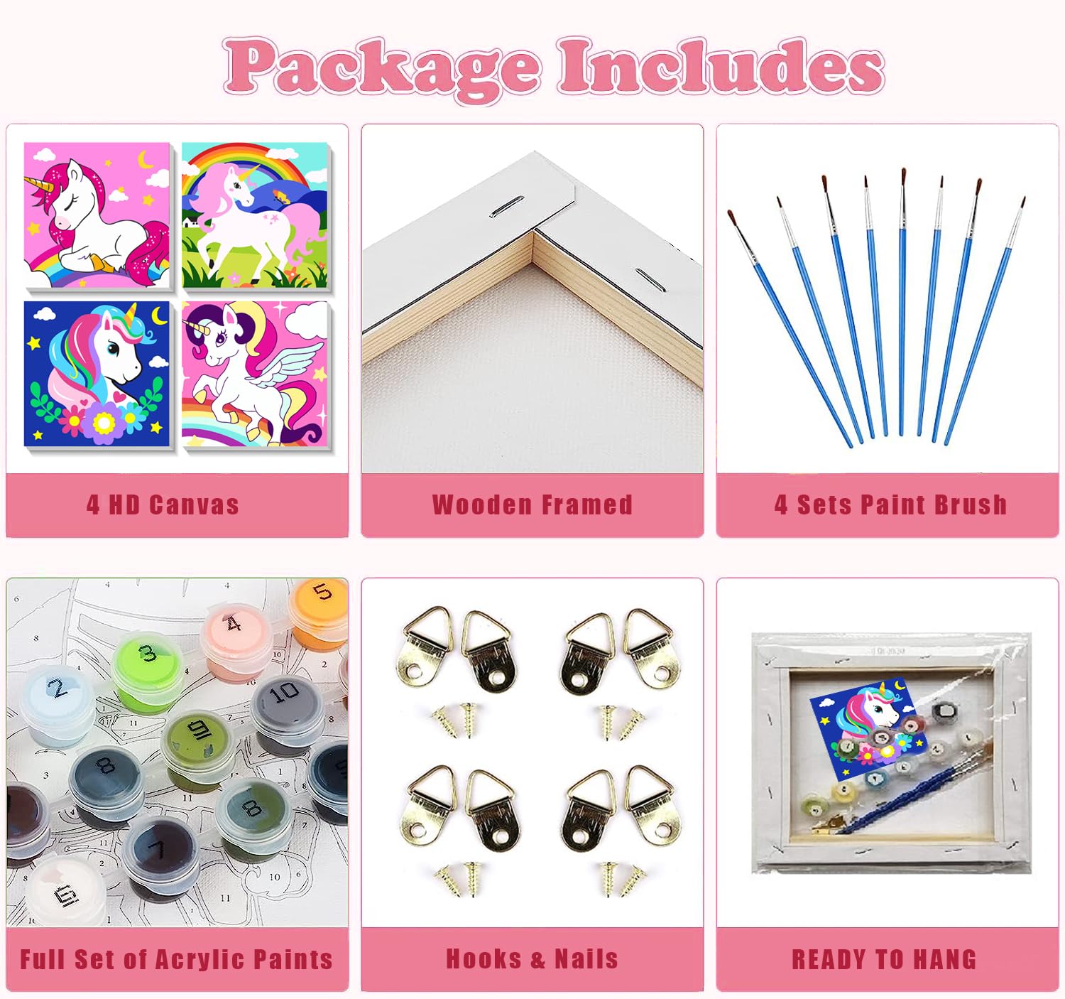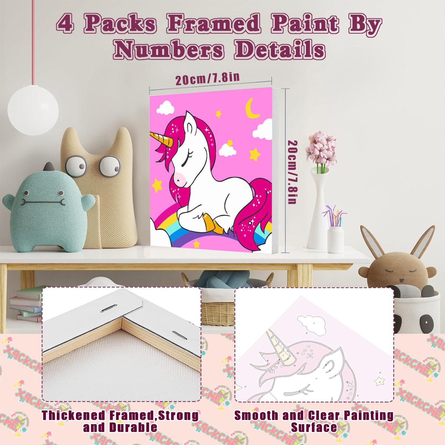 - 【What You Will Get】 Looking for a way to bring out your child's creativity or a way to relieve stress? Look no further than our Paint by Number 4-Pack! Each kit comes complete with a beautifully framed canvas featuring cartoon pattern, high-quality paint, and two brushes with different tips to help create the perfect work of art. We even provide Hooks for hanging their masterpiece as stunning wall decor. Get ready to cherish their art forever