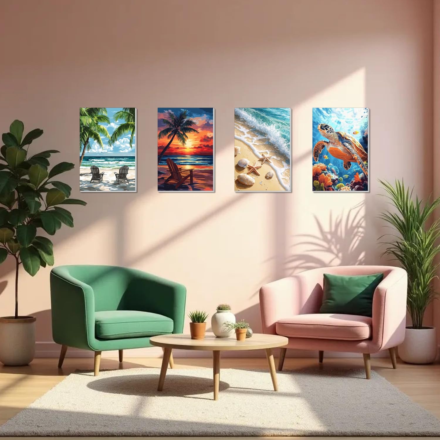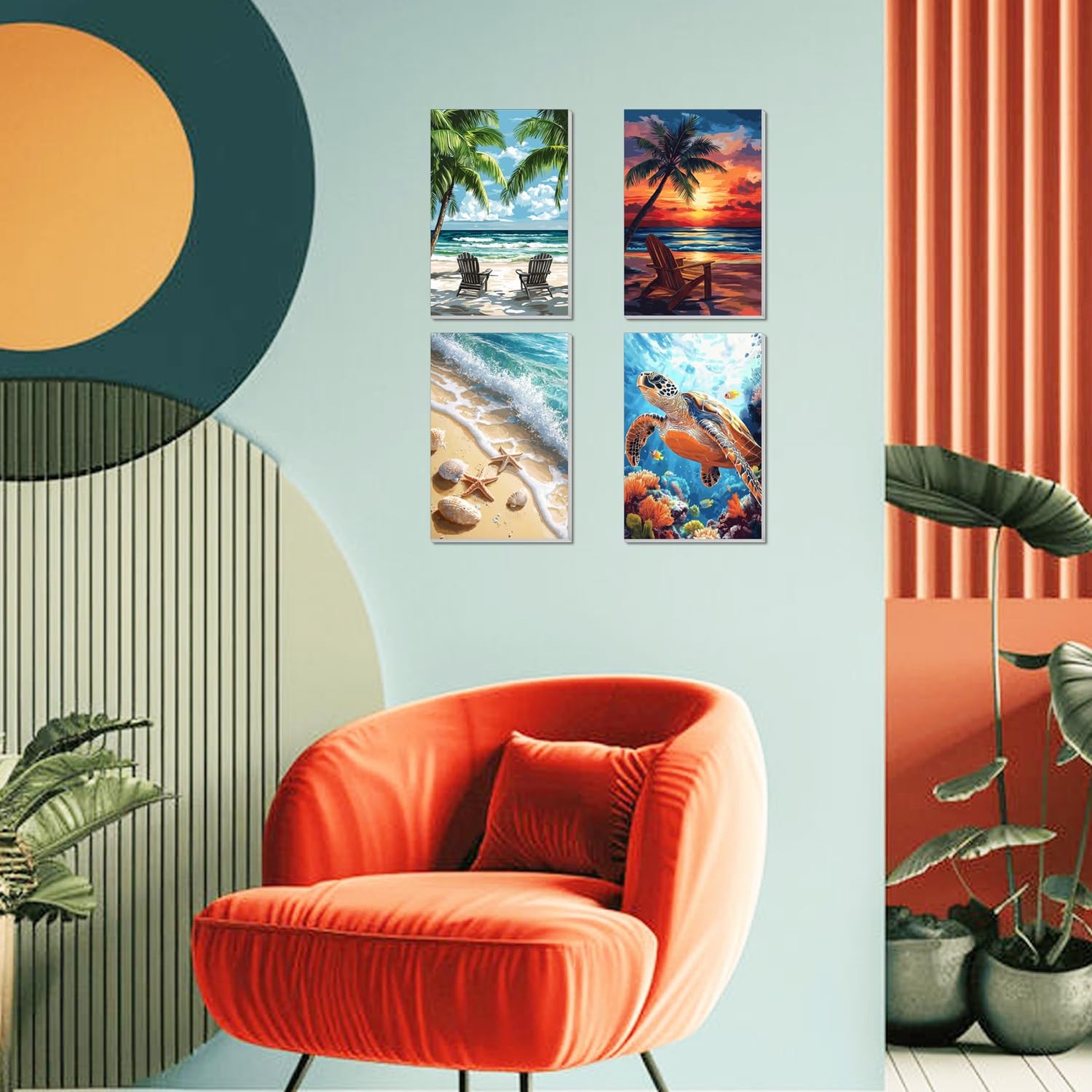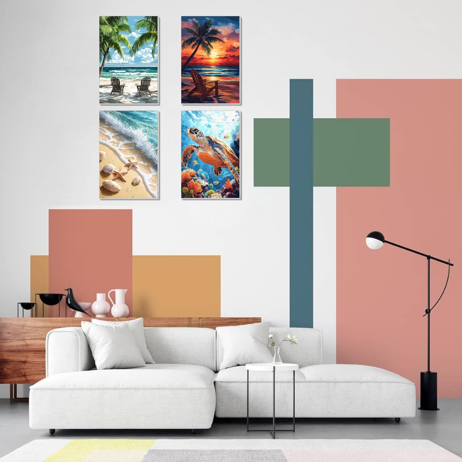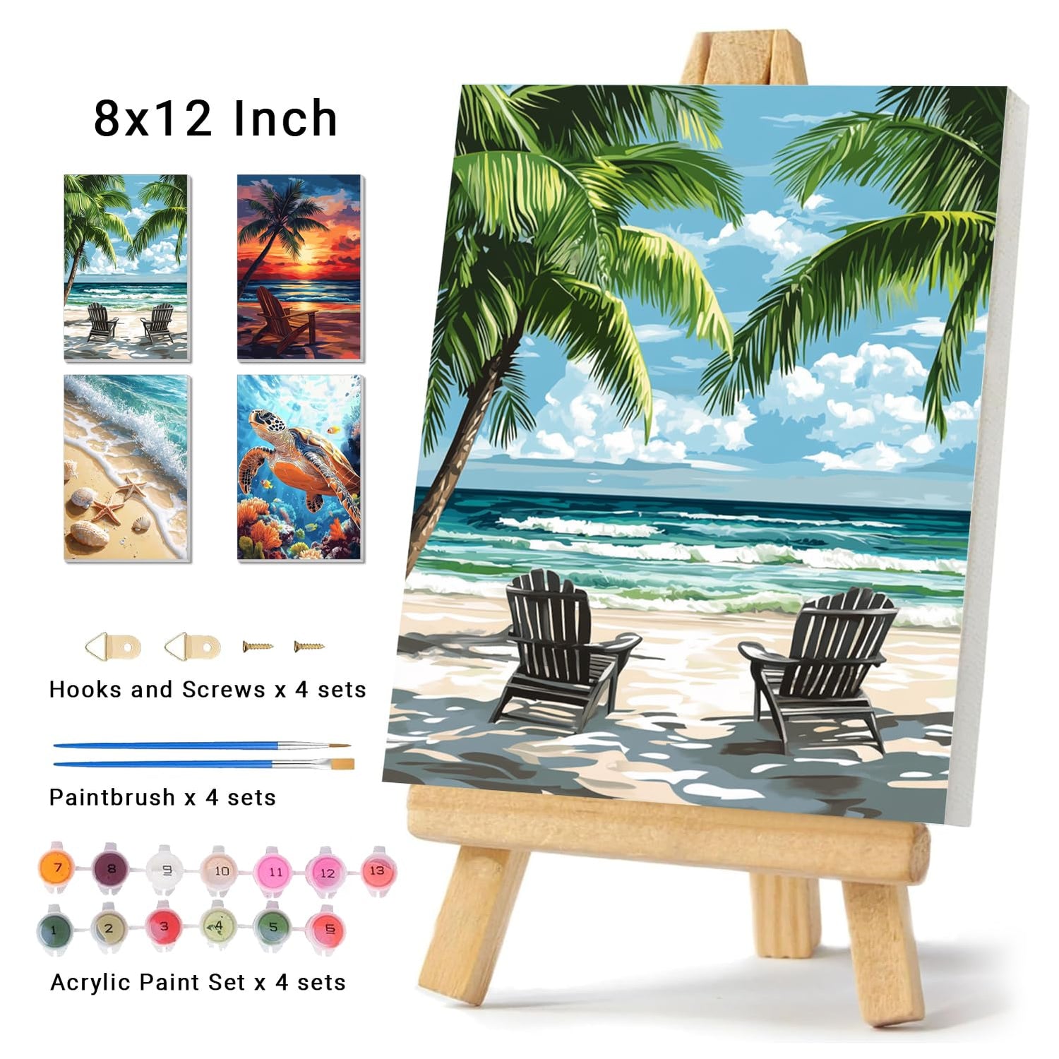 4 Pack Framed Paint by Numbers Kit for Adults Beginner Canvas Painting by Numbers for Adults Beach Easy Adult Paint by Number Kits with Frame Sea Turtle Watercolor Painting by Number 8x12 Inch