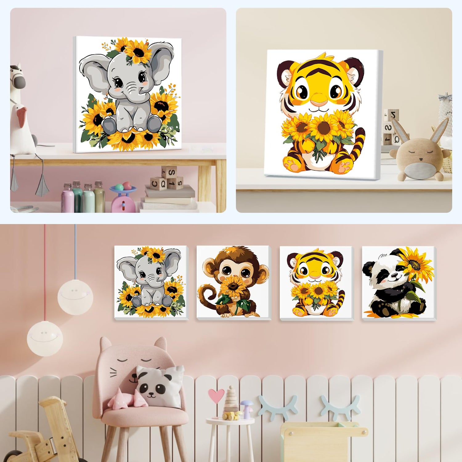 4 Pack Paint by Number for Kids with Wooden Frame, Cartoon Paint by Numbers for Kids Ages 8-12, Elephant, Monkey, Tiger, Panda, DIY Acrylic Oil Painting for Beginners for Home Wall Decor 8X8 inch