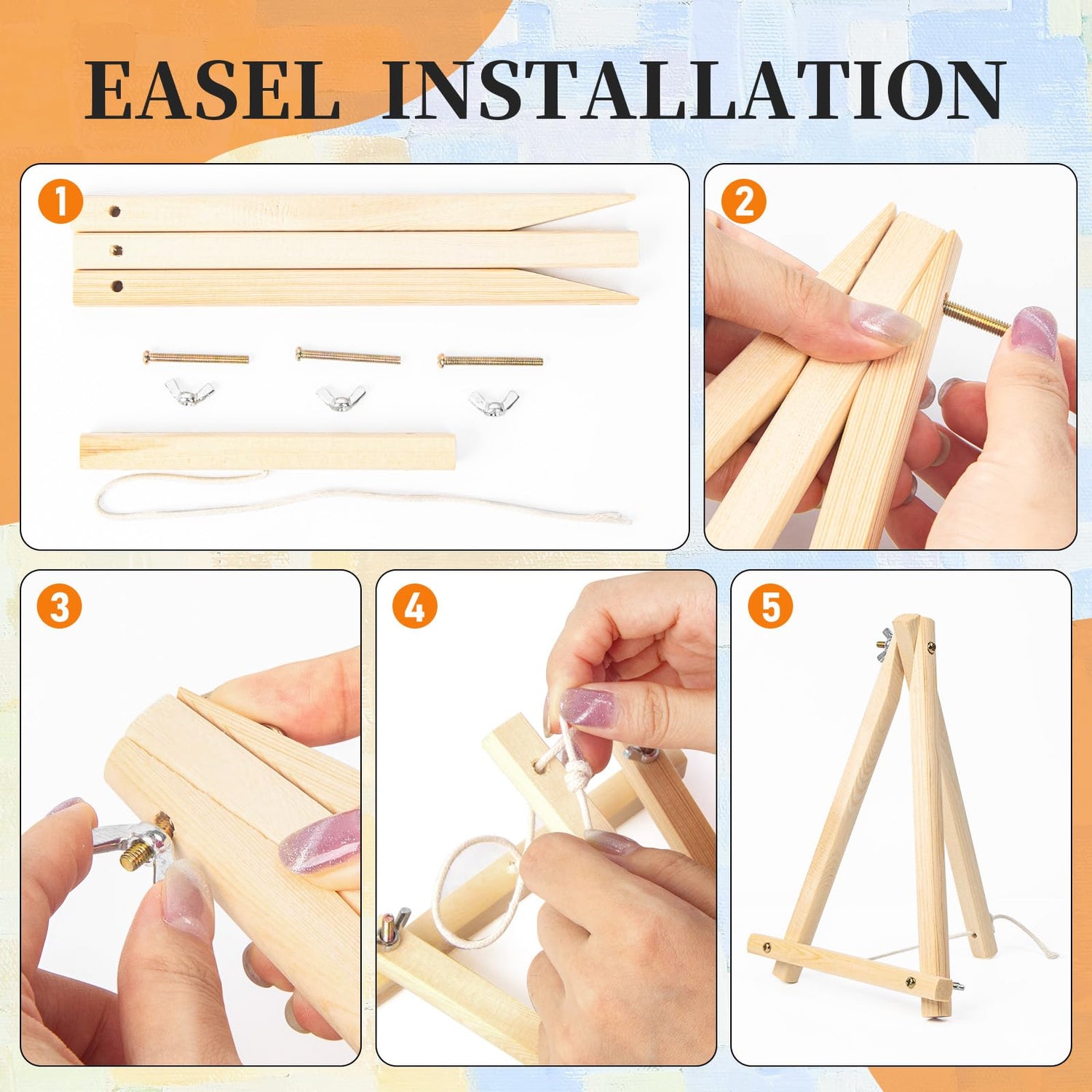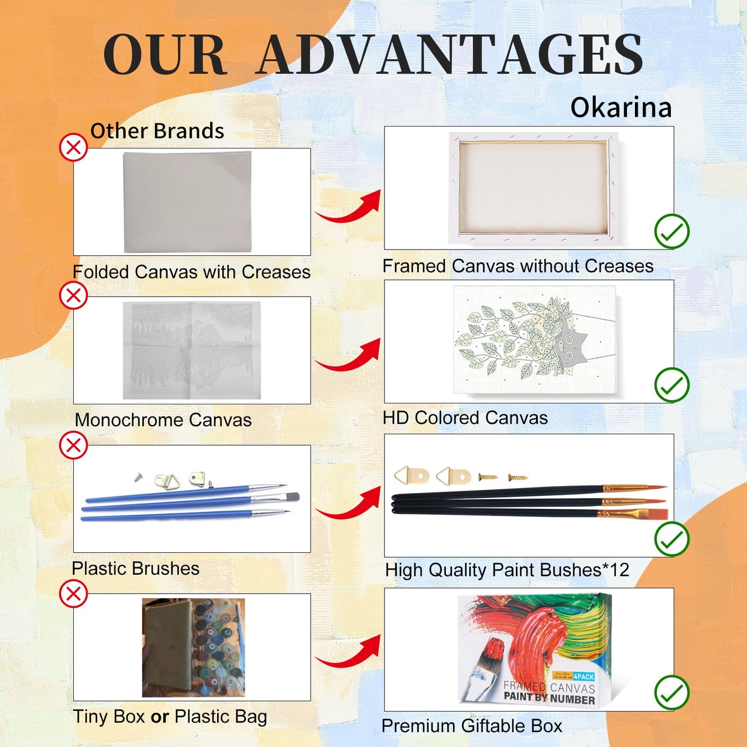 - 4 Pack Paint by Numbers with Frame Includes: 4 * HD color canvas with frame, 1 * wooden easel, 4 * acrylic paint set, 12 * wooden paint brushes, 8 * wall-mounted hooks & screws, 4 * color postcard, 4 * paper copy of pre-printed canvas and 1 * exquisite gift box.