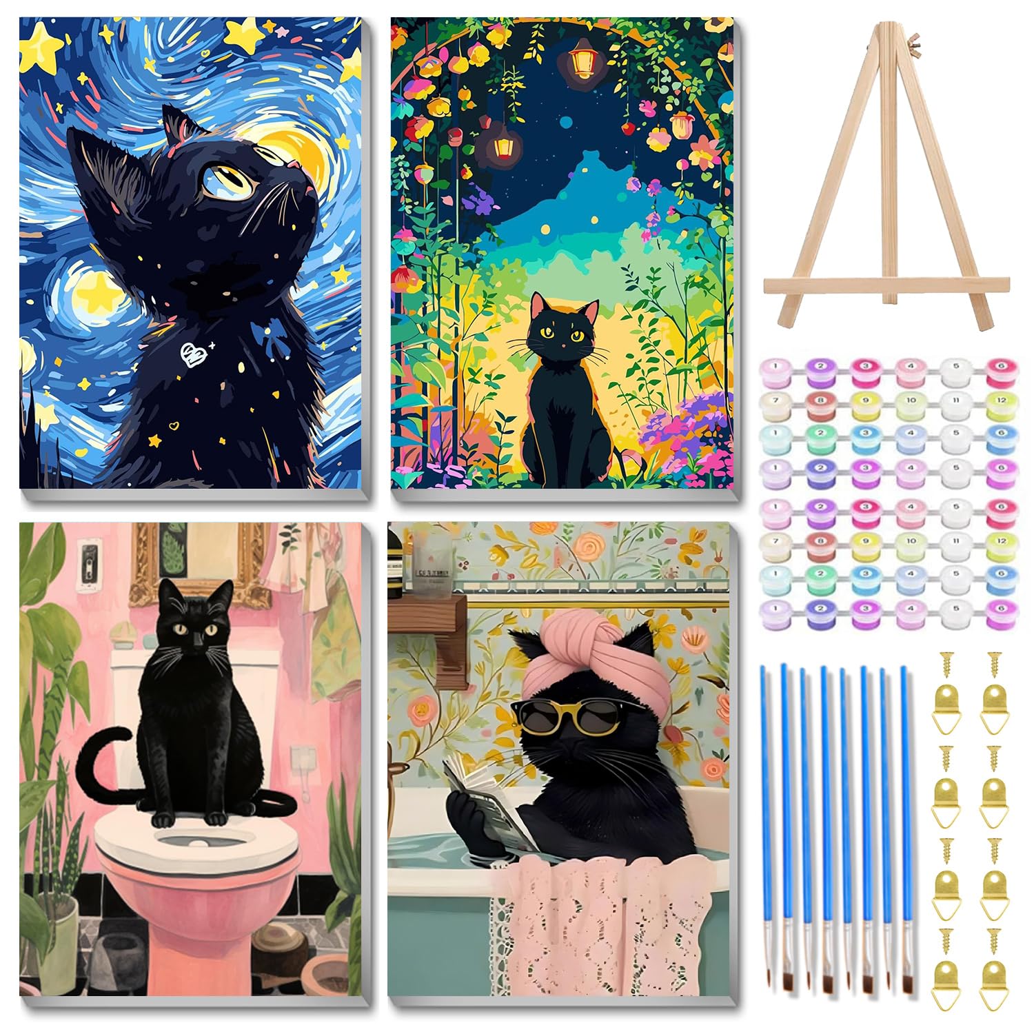 4 Pack Paint by Numbers Kit for Adults with Wooden Frames, Cat Paint by Number for Adults Beginners, Black Cat Paint by Numbers on Canvas Acrylic for Home Wall Art Decor 7.8x11.8Inch