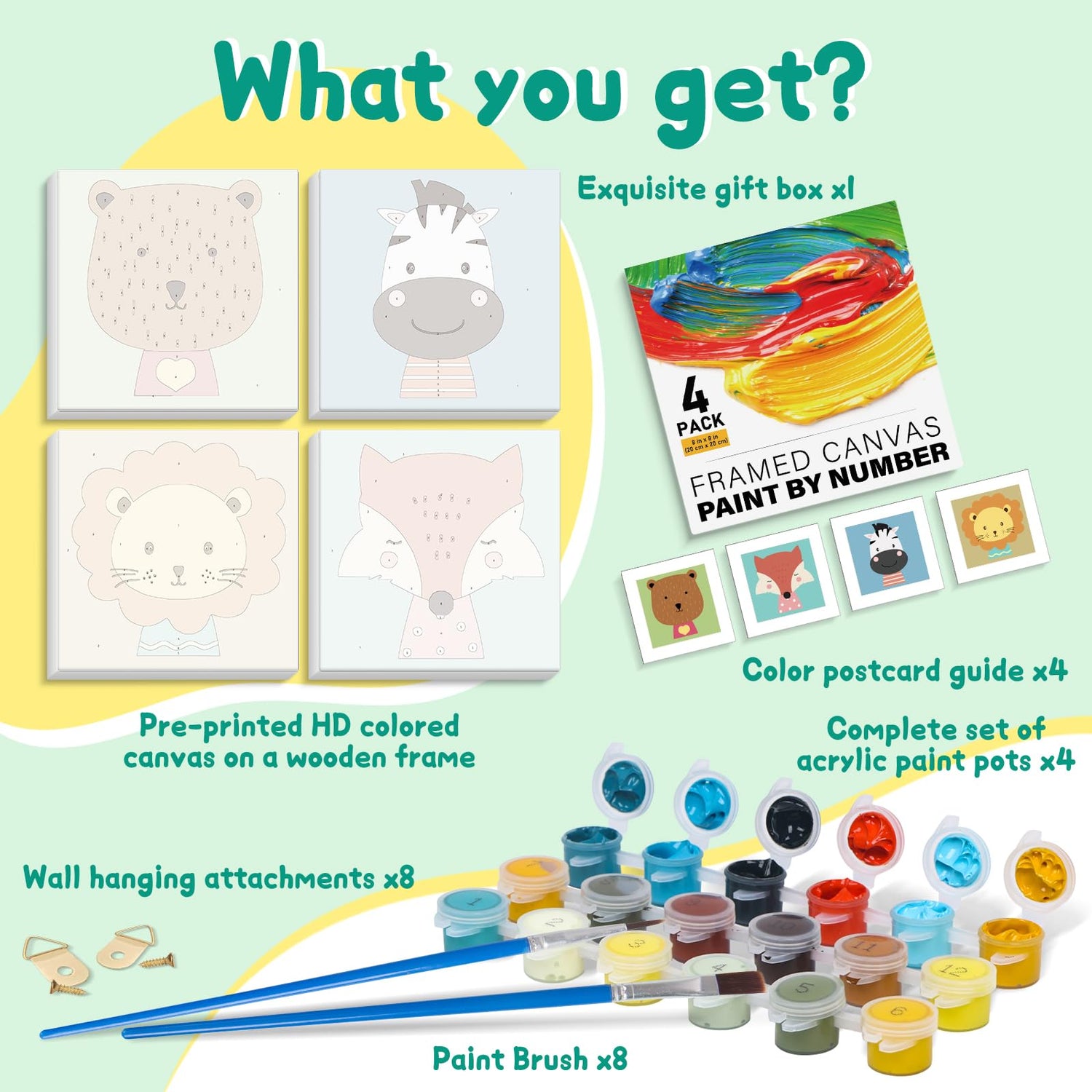 - đ¨ăWhat's Included In Offito Kids Paint By Numbers KităThis 4 pack different patterned kids paint by numbers kit contains the following for each set: 1 wooden framed canvas (8 * 8 in), 1 set of Acrylic Paints paints, 2 wall-mounted hooks & screws, 2 brushes, 2 adhesive hooks, 1 color postcard guide with the final image of the canvas.