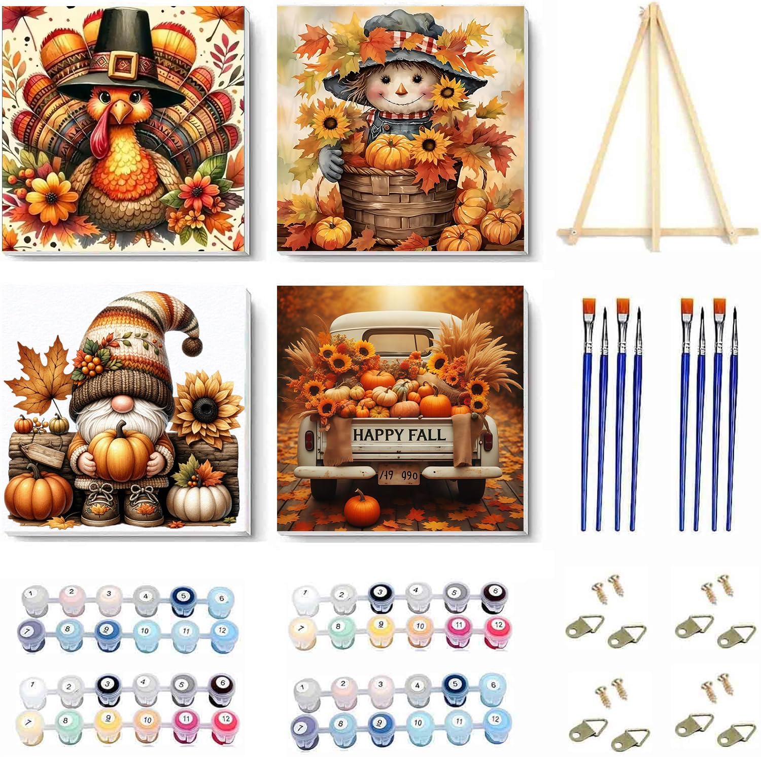 4 Pack Thanksgiving Day Paint by Numbers Kit for Adults Beginner,Fall Turkey Pumpkin Easy Adult Paint by Number Kits on Canvas DIY Painting for Beginners Art by Numbers for Home Wall Decor 10x10Inch