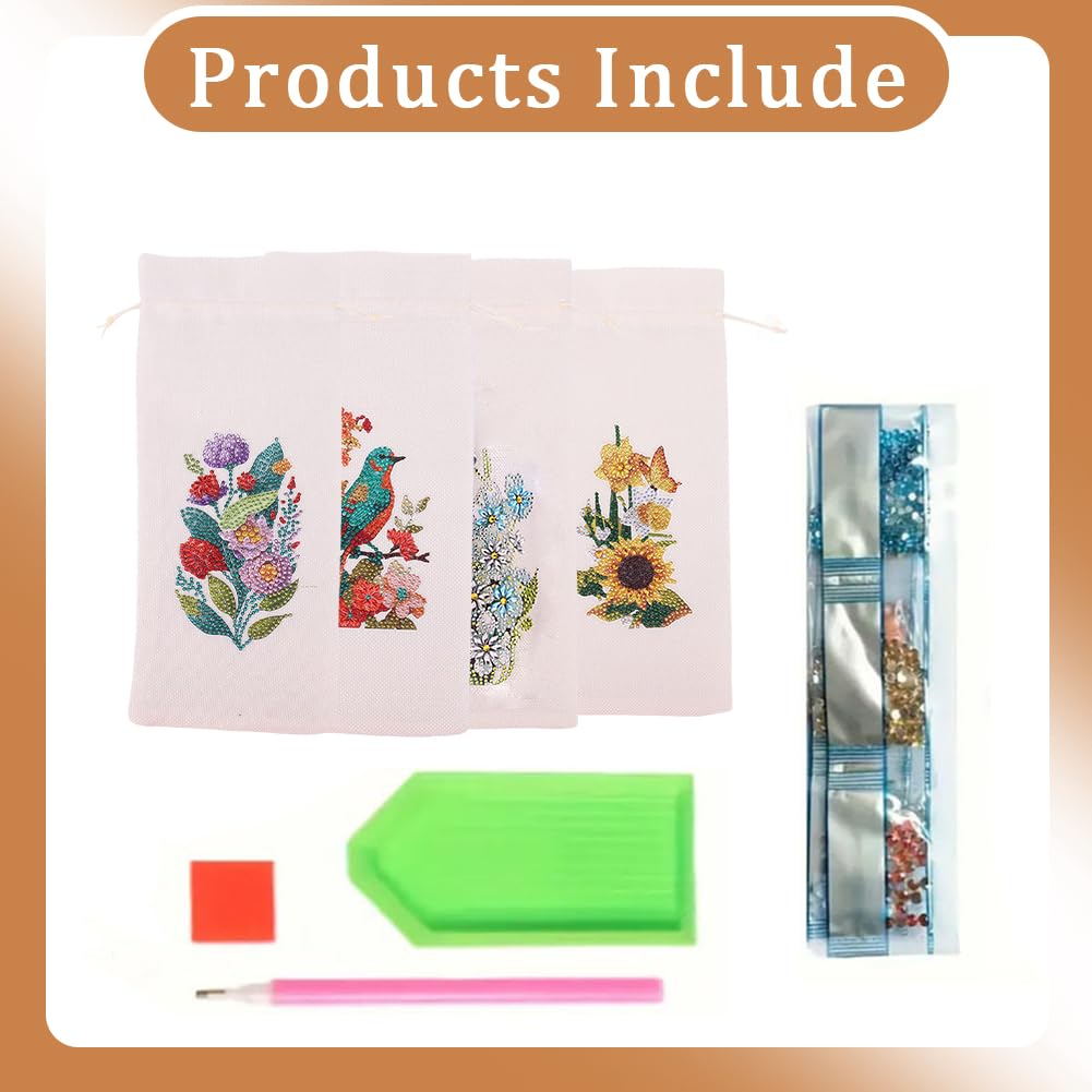 4 Pcs DIY Diamond Painting Art Kit Diamond Painting Wine Bag Kit Rhinestones Label Liquor Bottle Cover Gift for Wine Lover Women Men Christmas (Flower Birds)