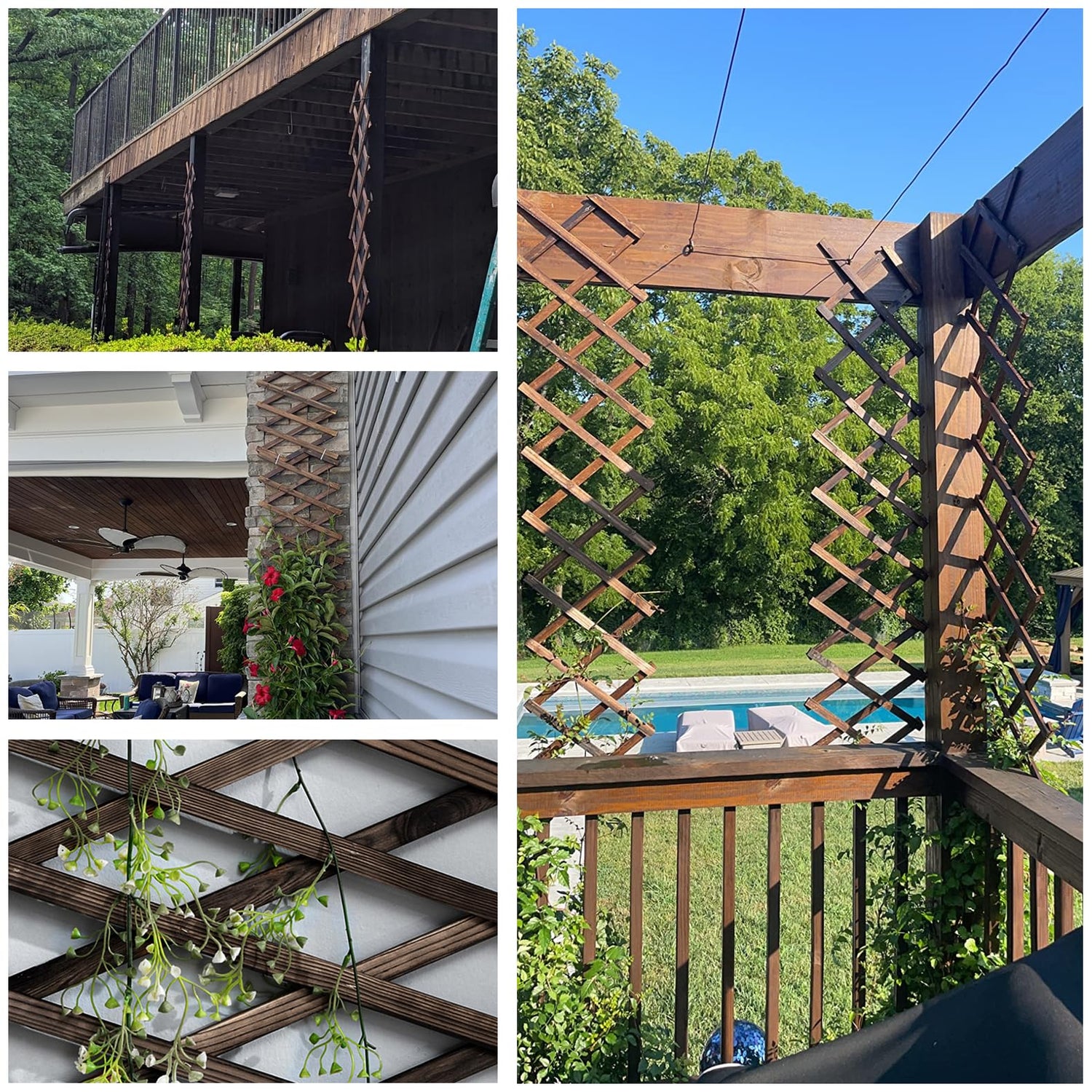 - 🌲 【USE IN MULTI-SCENE】: Retractable garden lattice used trellis for climbing plants outdoor, for ivy, rose vines, garden fence, small animal fence, patio partition, gazebo, courtyard wall, balcony privacy screen or living room wall decoration. The retro wooden lattice fence will create a warm and comfortable atmosphere, giving you a romantic pastoral life.