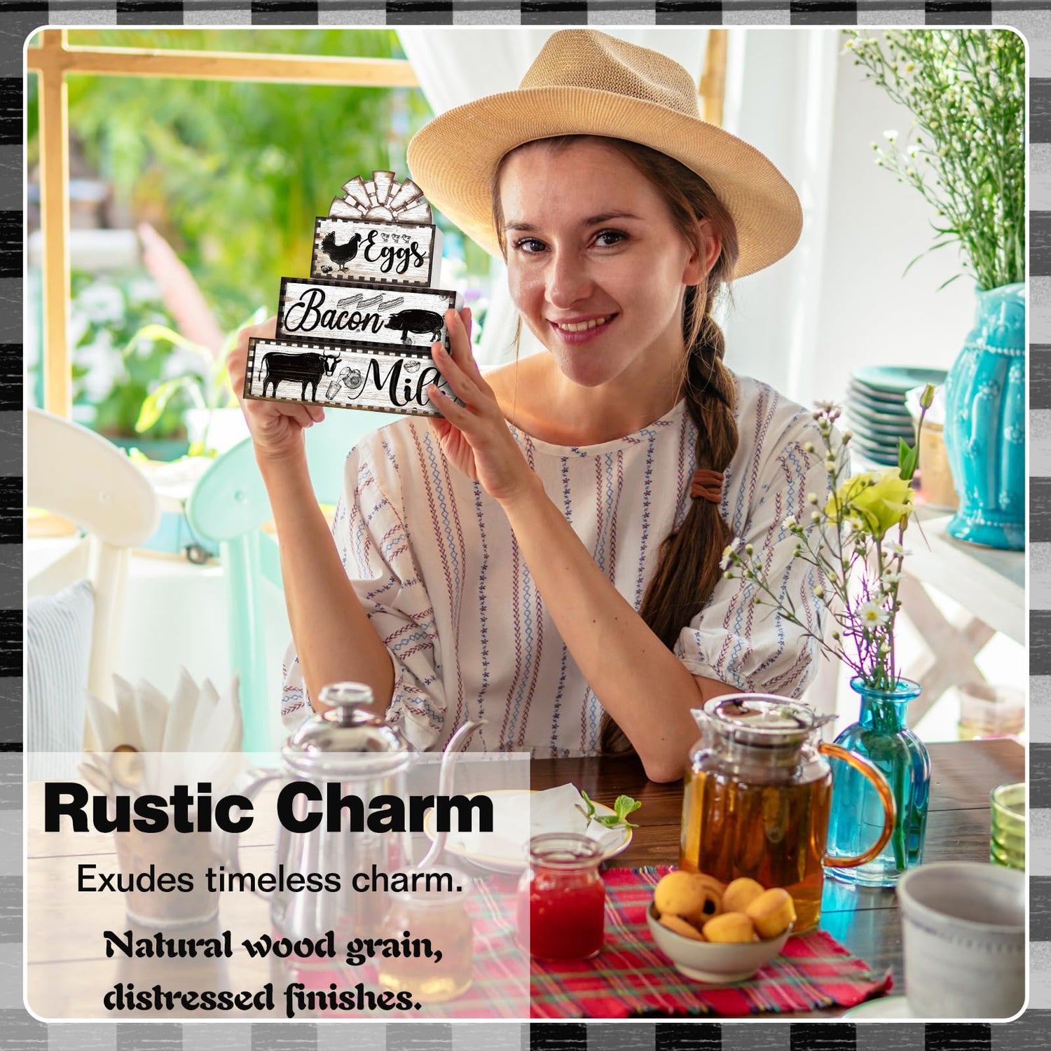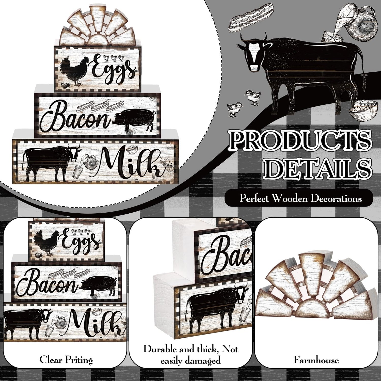 - Adorable Animal Patterns: a feature that sets these rustic wood signs apart is their cute animal patterns with corresponding letters, such as cow, rooster and pig, symbolizing bacon, milk and eggs, bringing a full pastoral and warm decorative effect to your kitchen and farmhouse space; This addition brings a hint of playfulness and fun into your space, demonstrating that a farmhouse theme can also be delightful