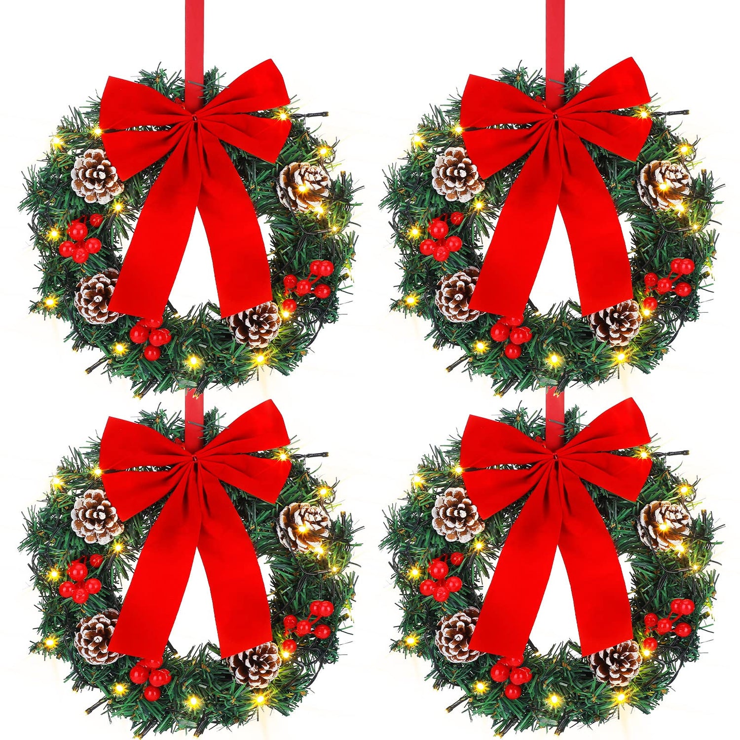 - Christmas Wreaths with Lights: you will receive 4 pieces of Christmas wreath decorations, and each wreath is pre lit with 30 warm white LED lights, decorated with a big red bow, 4 pieces of small pine cones and 3 bunches of red berries, lifelike and decorative, full of strong festive atmosphere
