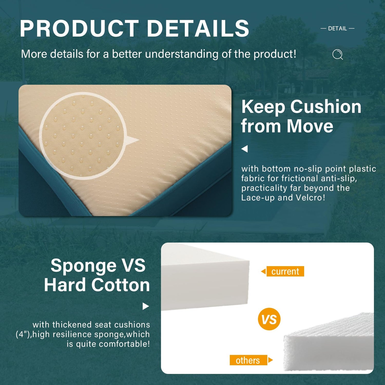 - Comfortable and Anti-slip: Seat cushions(4 inches) with high resilience sponge and bottom anti-slip dotted plastic fabric, anti-slip, and practicality are wholly better than lacing, velcro or hook, match up filling back cushions, which is extraordinarily comfortable and everlasting with outdoor conversation sets. Free lumbar pillows style randomly
