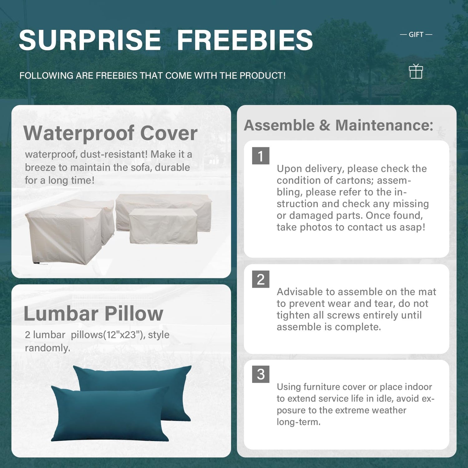 - Assembly and After-sales: The patio sectional includes 3 boxes with clear instructions and all necessary hardware for speedy, smooth assembly. Any problems, let us know without hesitation, and our team will respond to you promptly and the powerful solutions