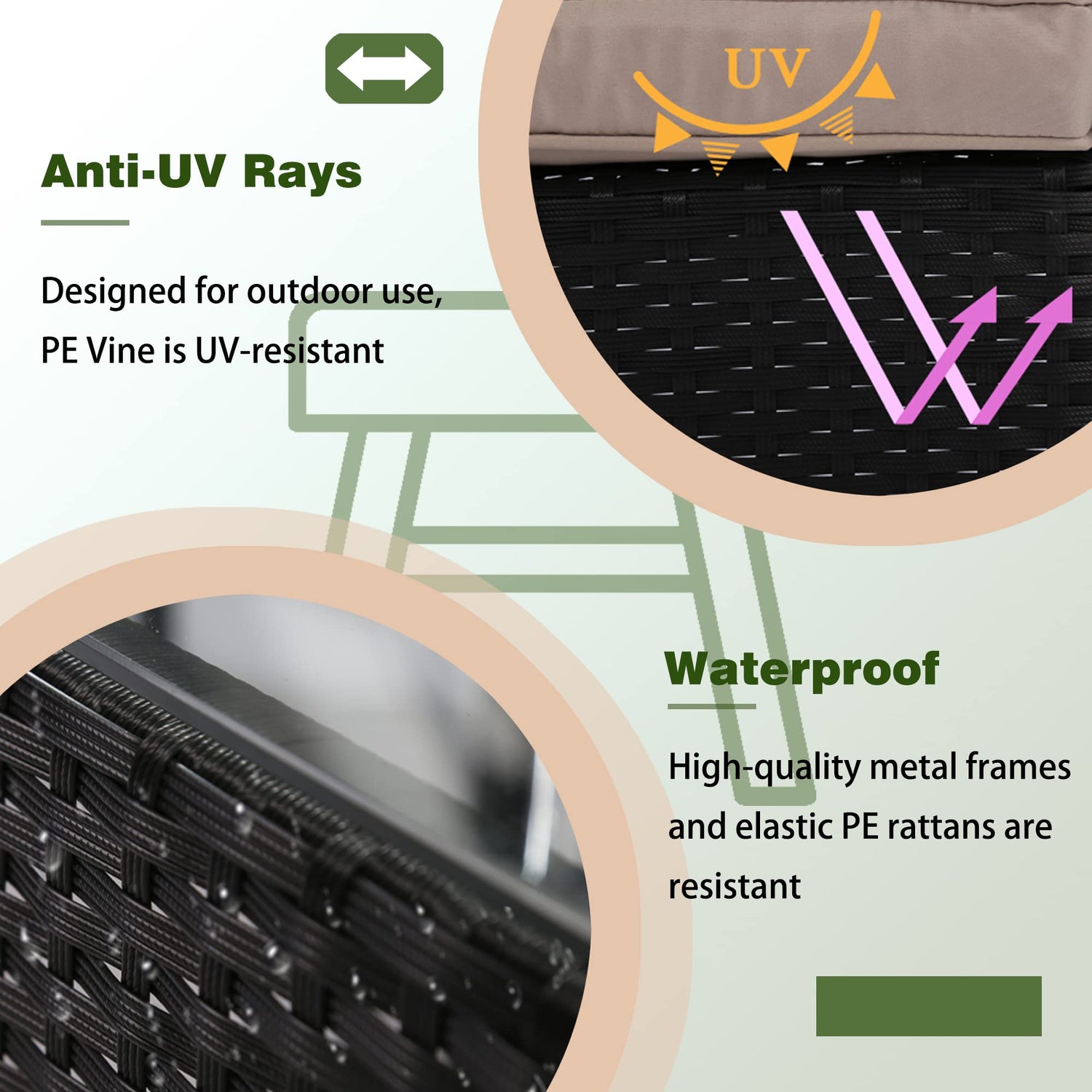 - Rugged and Durable: The outdoor furniture set is made of high-grade rattan material with a weatherproof formula. It can be used all-weather and can resist cracking, fading, decay and so on. Ensure a longer service life. The rust-proof steel frame supports the gradient rattan structure, the structure is sturdy and durable.