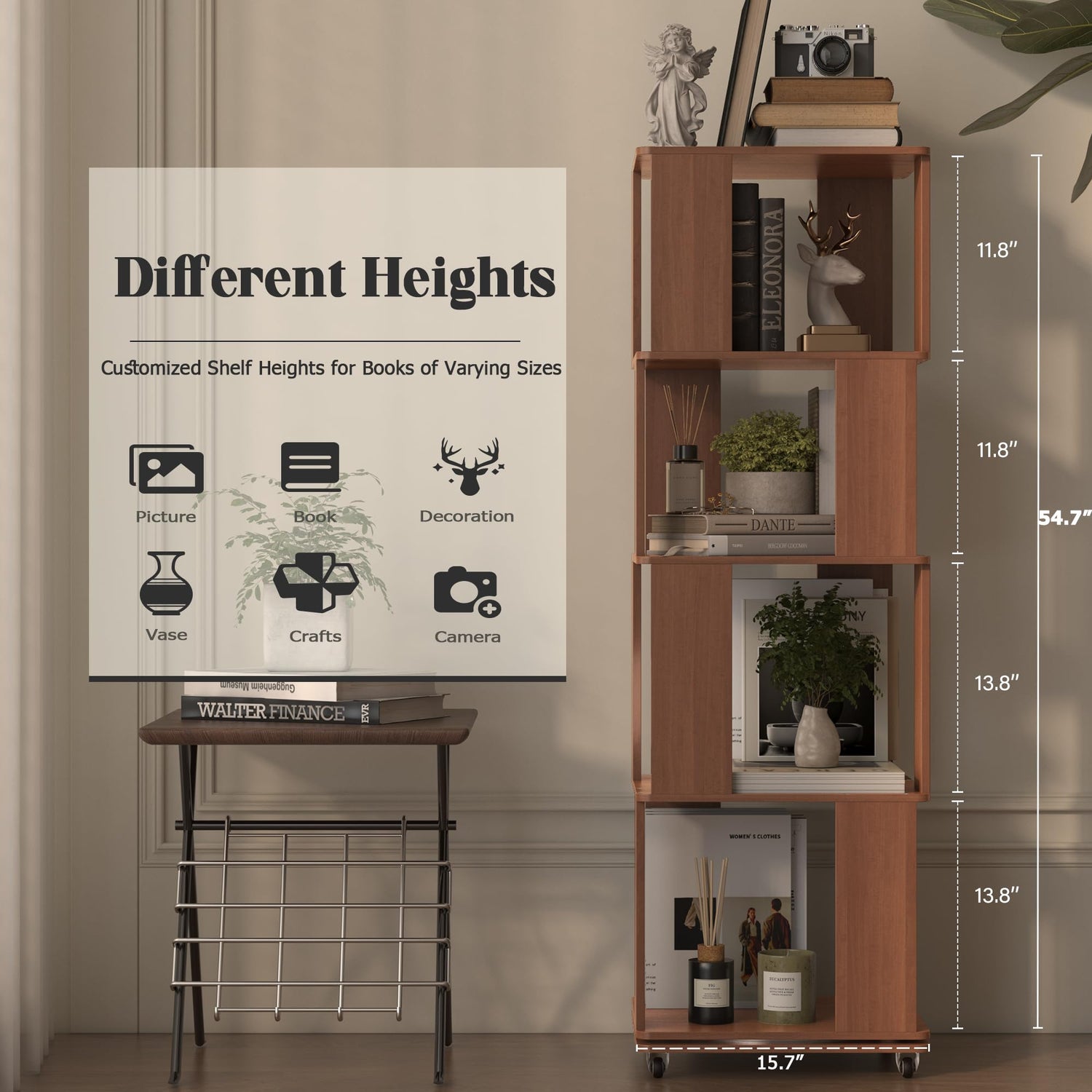 - 【Large Capacity & Space Saving】4-tier rotating bookshelf stands with 11.8" and 13.8" layer heights, 54.7" tall. The thickened 15.7"x15.7" base can holds different size of 100 books(about 25 books per shelf), stores decor or toys—practical and spacious