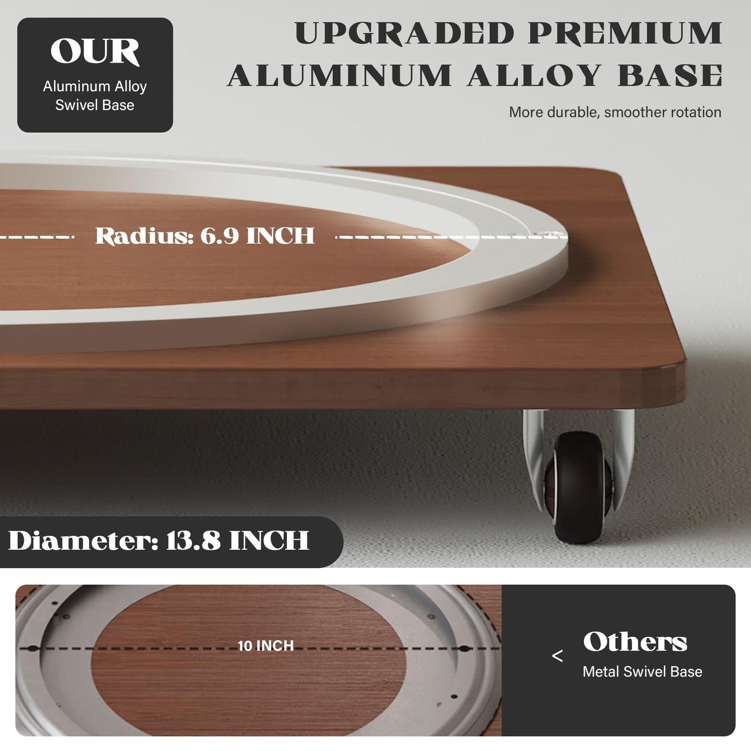 - 【Sturdy, Safe & Lockable Wheels】Reinforced 13.8" aluminum alloy turntable supports up to 290 lbs, 360°rotating book shelf with locking wheels provide firm stability, preventing tipping for ultimate safety in homes with kids or pets. This swivel bookshelf stands firm and flush to the ground without shaking when wheels are not installed