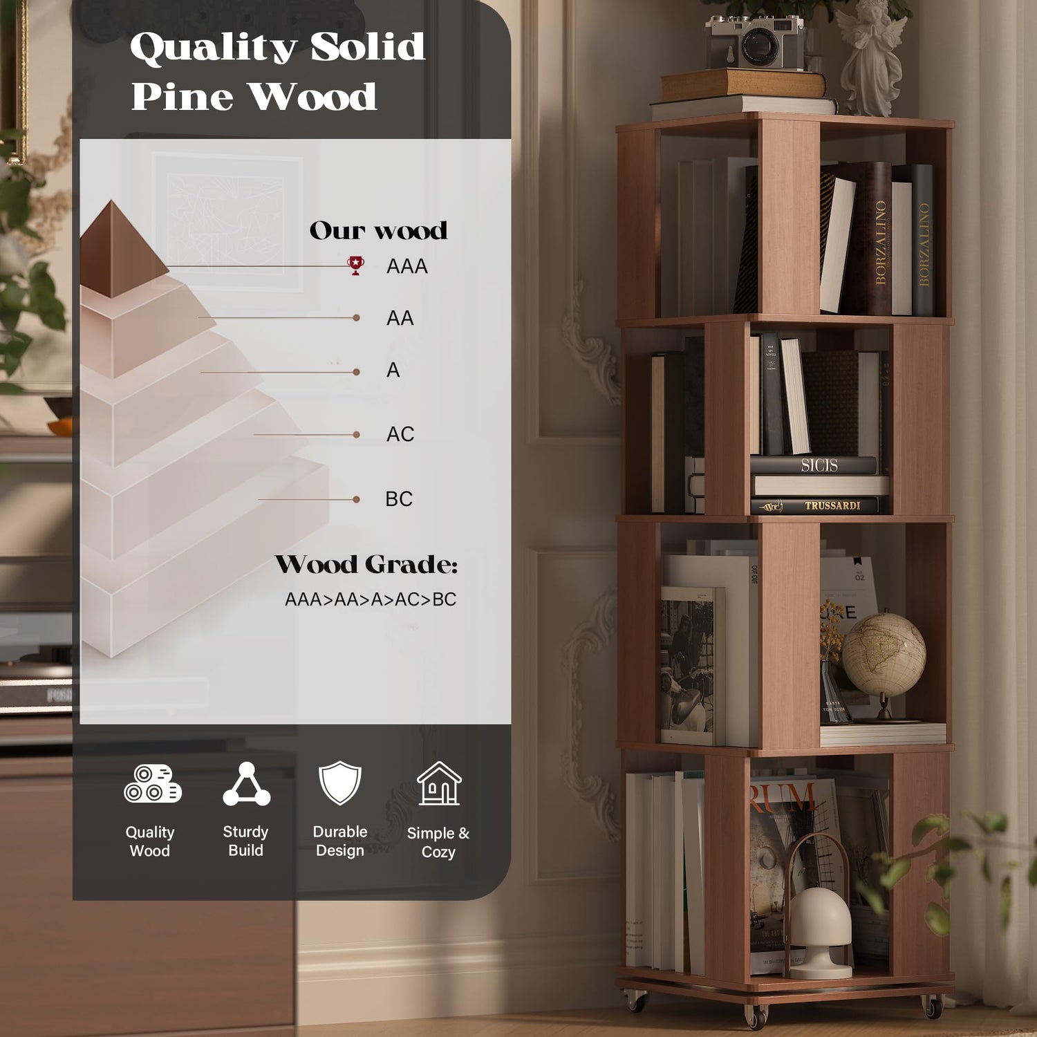 - 【Premium Solid Wood Revolving Bookcase】Crafted from high quality solid wood which is safe and durable. Carefully sanded to a flawless, smooth surface and protect your hands. The minimalist design saves space, making it suitable for the living room, bedroom, study, and children's room. The wood grain adds a warm, textured feel to any home