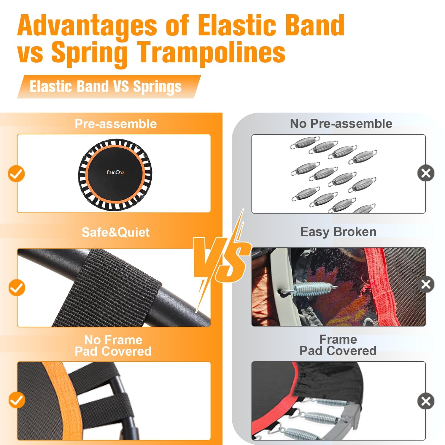 - 【Indoor & Outdoor Exercise Trampoline】FitinOne fitness trampoline builds various muscle groups and strengthens shoulders, hips, and legs. Just 10 minutes of indoor fitness trampoline equals 1 hour of jogging, 30 minutes of cycling, or 20 minutes of swimming, making it great for weight loss.